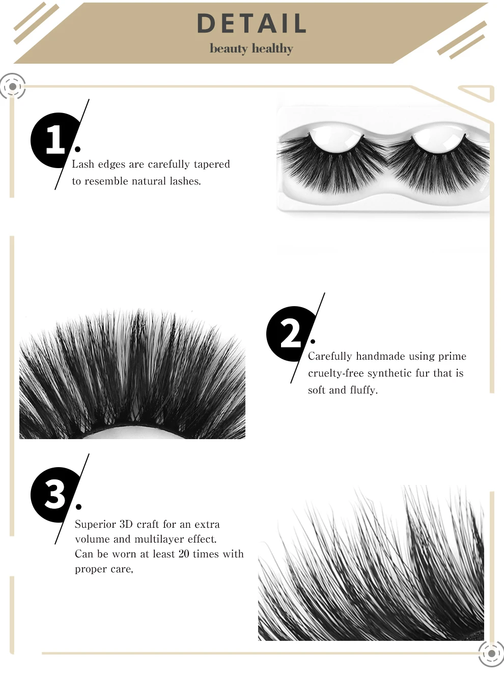Тип: Искусственные ресницы Упаковка: одна пара ресниц + клей для ресниц 1 мл Размеры: 25 мм Цвет: натуральный черный Материал изготовлен из высококачественного тонкого синтетический волокнистый материал, мягкий и легкий. 100% ручная работа и безжалостность. Особенности: удобные и мягкие, используя технологию моделирования ресниц, ресницы могут быть такими же естественными и мягкими, как человеческие ресницы. 3D дизайн, увеличьте глаза, увеличьте ваше личное очарование и заставьте вас выделяться постоянно. Применение: 1. Удалите накладные ресницы и обрежьте их по длине глаз. 2. Используйте обе руки для регулировки накладных ресниц, чтобы соответствовать вашей кривой глаз. 3. Аккуратно нанесите клей на основной стержень накладных ресниц. 4. Подождите несколько минут, пока клей не высохнет, пока клей не станет почти прозрачным. Это идеальное время для нанесения ресниц на веки. 5. Закройте глаза по мере необходимости и убедитесь в правильности, мигая. 6. Увидеть идеальные и сияющие глаза.