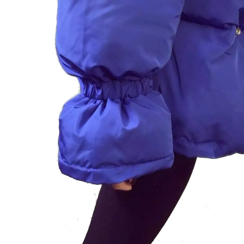 Воротник-стойка, эластичные рукава, свободный стиль, красивый синий цвет.