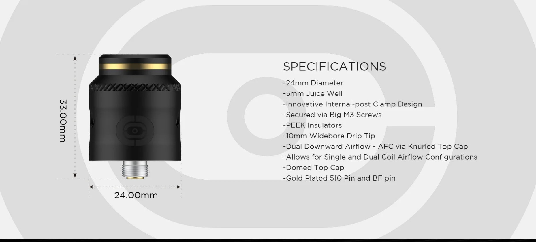 Диаметр: 24 мм Сок хорошо: 5 мм Нить: 510 Тип: Одинарная/двойная катушка RDA