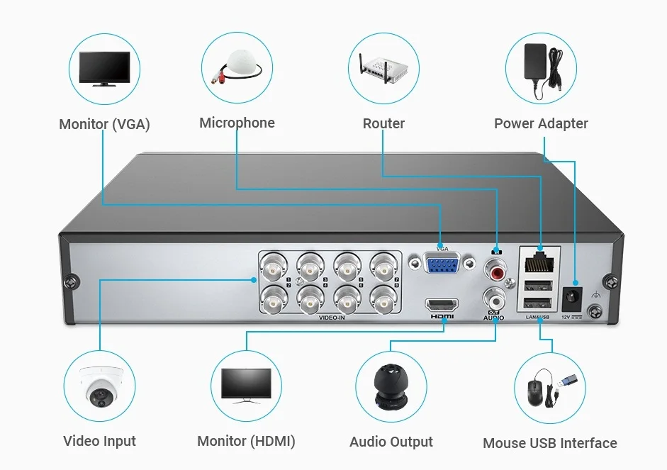 1 * цифровой 8-канальный видеорегистратор DS-7208HGHI-F1/N (поддерживает максимум 8 камер по 2 мегапикселя) 4 * камера с инфракрасным фильтром DS-2CE56D0T-IRF 4 * камера с инфракрасным фильтром DS-2CE16D0T-IRF 8 * адаптер питания 12 В 1 * HDD (на выбор)