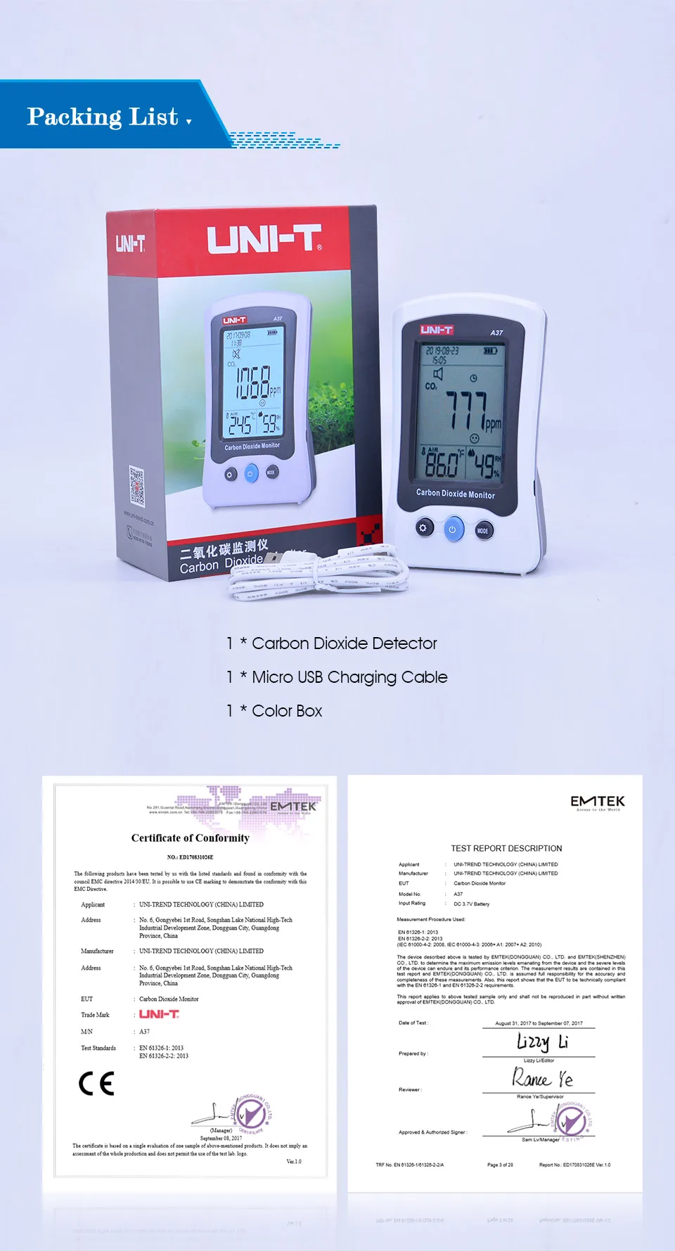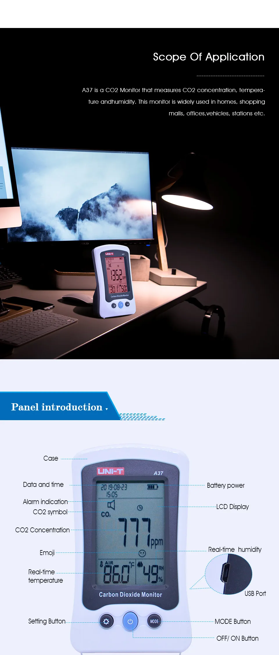 A37 используется для обнаружения концентрации CO2 в различных средах. ЖК-дисплей отображает концентрацию CO2, температуру, влажность и дату/время вместе. Качество воздуха указано с помощью смайликов. Когда концентрация CO2 становится слишком высокой, звуковая и визуальная сигнализация выключается.