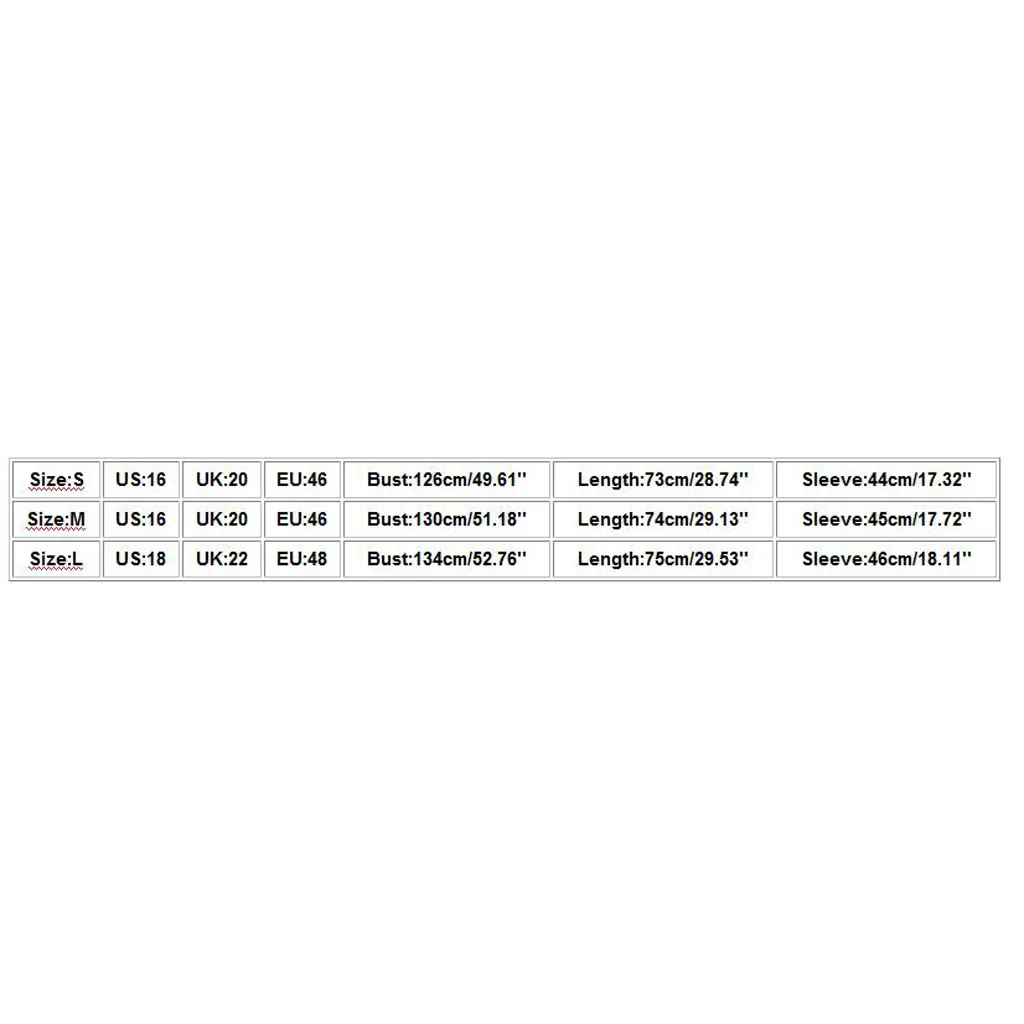 Size:SUS:16UK:20EU:46Bust:126cm/49.61''Length:73cm/28.74''Sleeve:44cm/17.32''Size:MUS:16UK:20EU:46Bust:130cm/51.18''Length:74cm/29.13''Sleeve:45cm/17.72''Size:LUS:18UK:22EU:48Bust:134cm/52.76''Length:75cm/29.53''Sleeve:46cm/18.11''