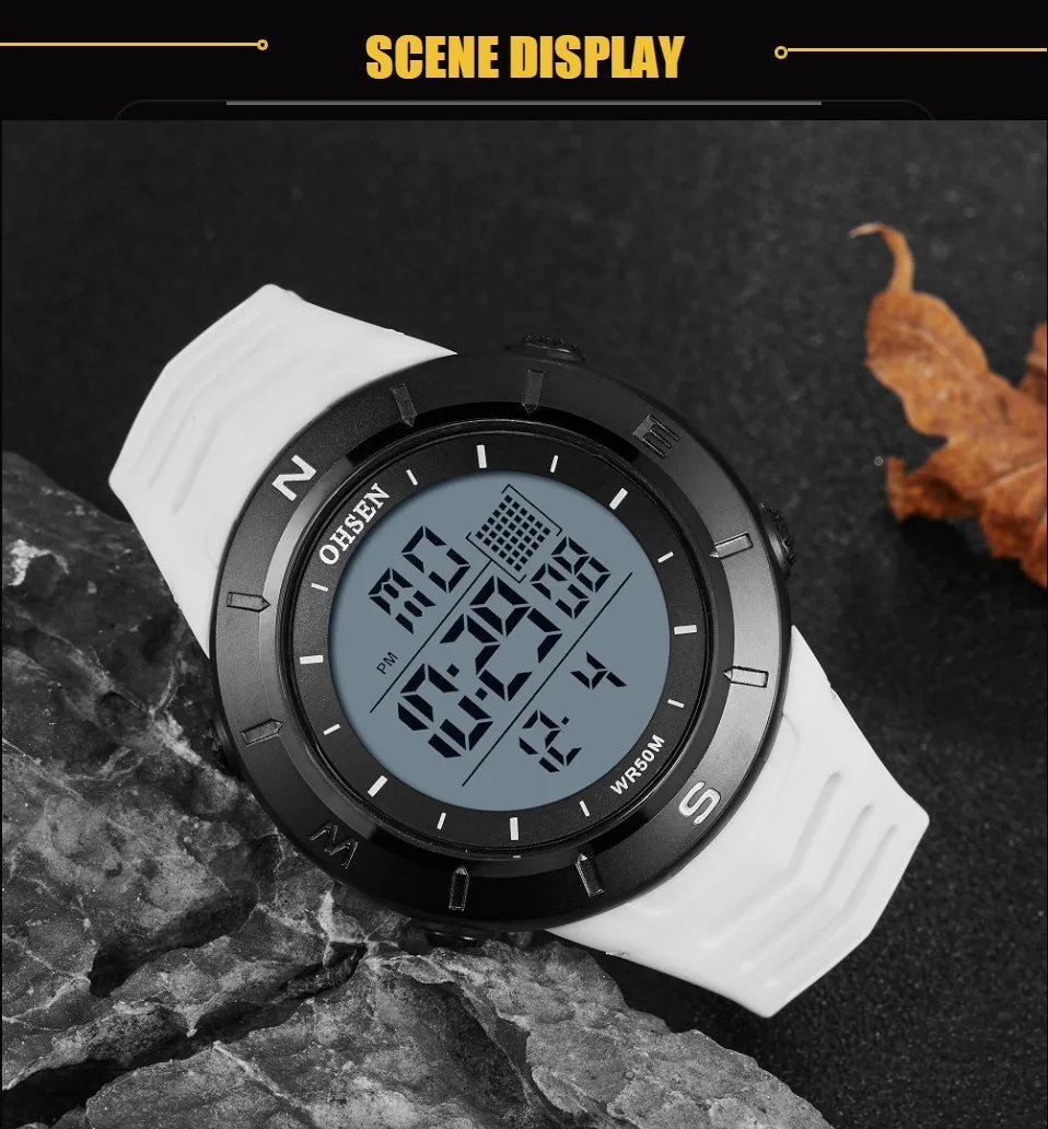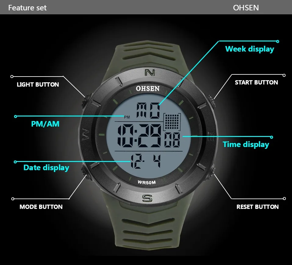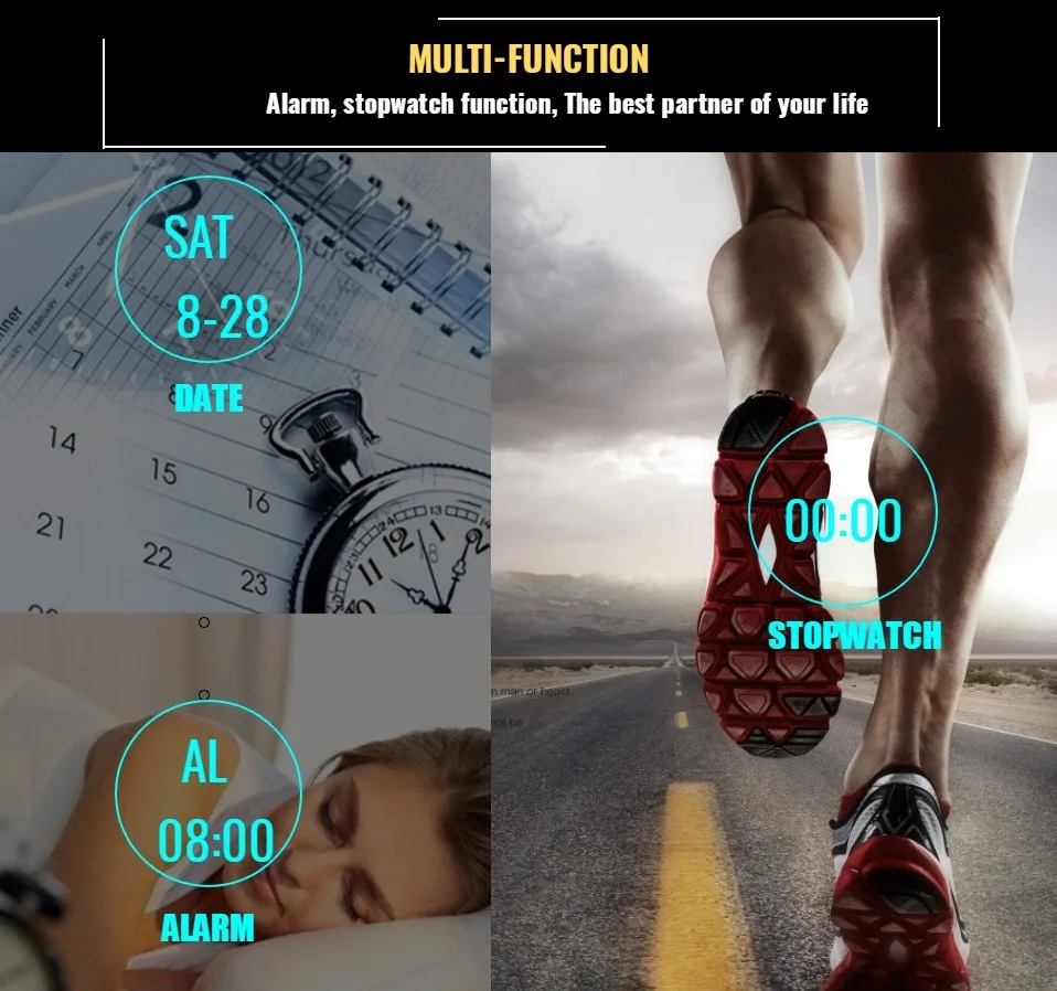 Цифровой: часы, минуты, секунды, вечера, месяц, дата, день 12/24 час формиат Будильник и функция ежечасного звонка Специальная конструкция с хронограф (секундомер) при температуре не выше 0,01 второй шаг Дополнительный ЖК-светильник для отображения времени в темноте 50 м водонепроницаемый, поплавайте вместе с ним Функция секундомера, запись времени, ваш лучший спортивный партнер Ударопрочность, подходит как для занятий спортом на открытом воздухе, так и для занятий спортом в помещении