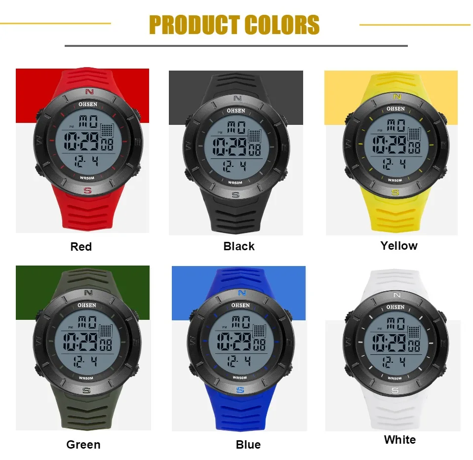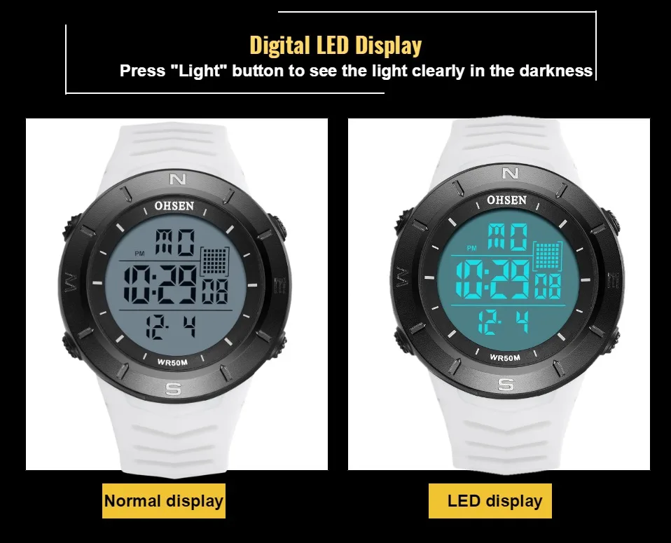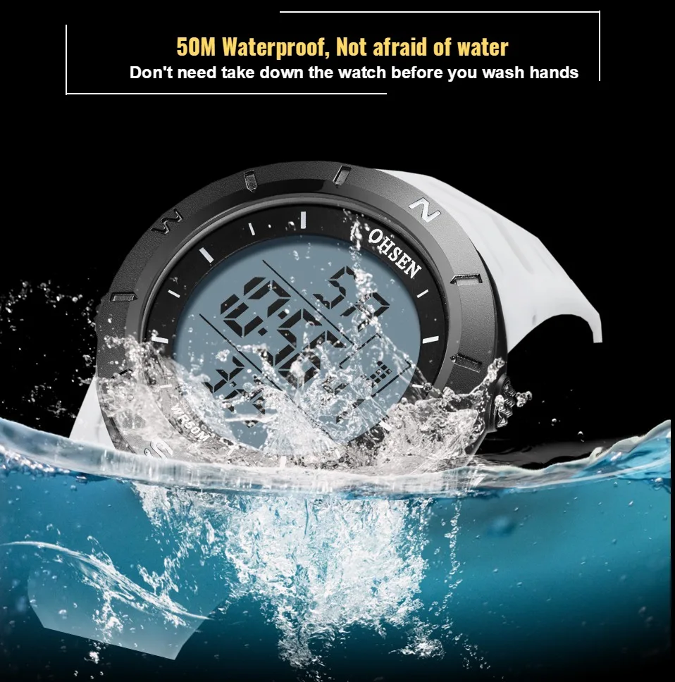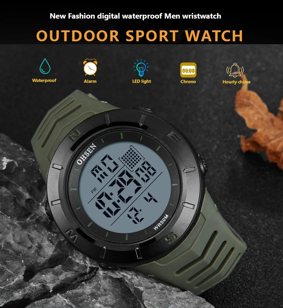 Цифровой: часы, минуты, секунды, вечера, месяц, дата, день 12/24 час формиат Будильник и функция ежечасного звонка Специальная конструкция с хронограф (секундомер) при температуре не выше 0,01 второй шаг Дополнительный ЖК-светильник для отображения времени в темноте 50 м водонепроницаемый, поплавайте вместе с ним Функция секундомера, запись времени, ваш лучший спортивный партнер Ударопрочность, подходит как для занятий спортом на открытом воздухе, так и для занятий спортом в помещении