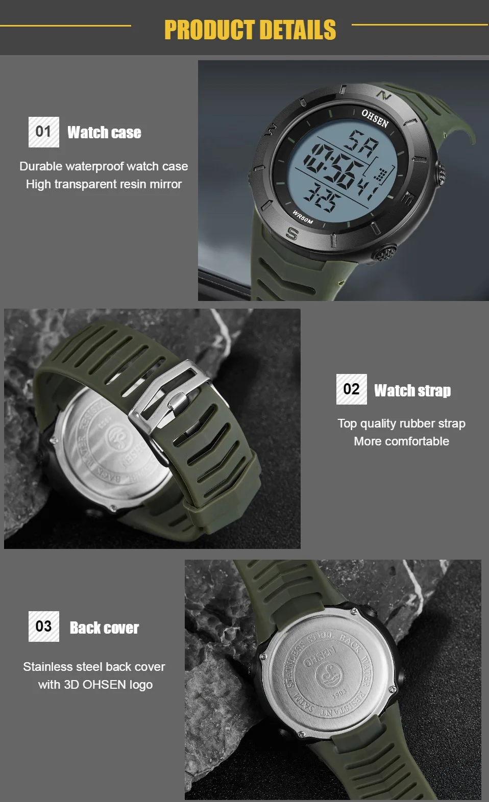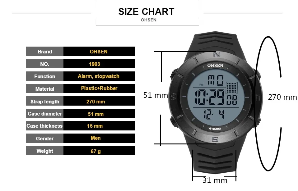 Прочный водонепроницаемый чехол Защитная пленка высокой прозрачности зеркало из смолы Резиновый ремешок хорошего качества, более удобный Задняя крышка из нержавеющей стали с 3D логотипом OHSEN Параметры продукта: Чехол Диаметр: 51 мм/1,99 дюймов Чехол Толщина: 15 мм/0,59 дюймов Цвет ремешка: как на картинке Длина ремешка: 270 мм/10,63 дюйма (ремешок можно регулировать) Ширина ремешка: 31 мм/1,22 дюйма