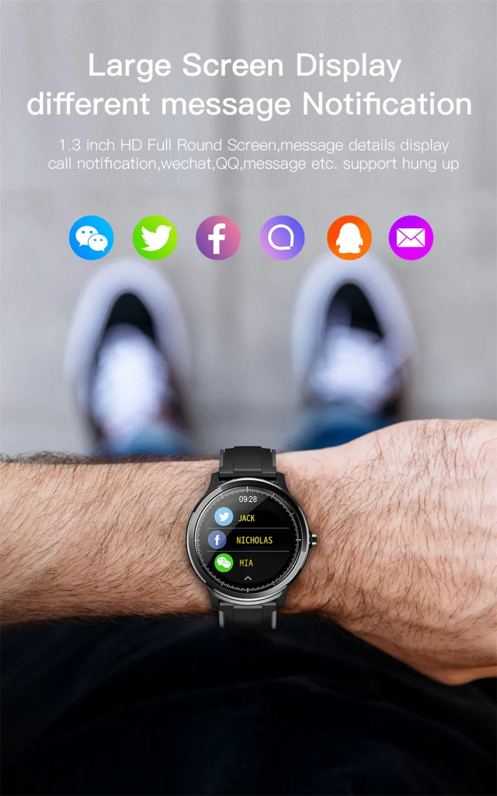 4. 1,3 дисплея высокой четкости в форме круга экран полный сенсорный экран, оповещение о поступлении сообщения, содержание непосредственно Дисплей: Идентификатор вызывающего абонента, WeChat, QQ, SMS, поддержка Отклонение вызова.