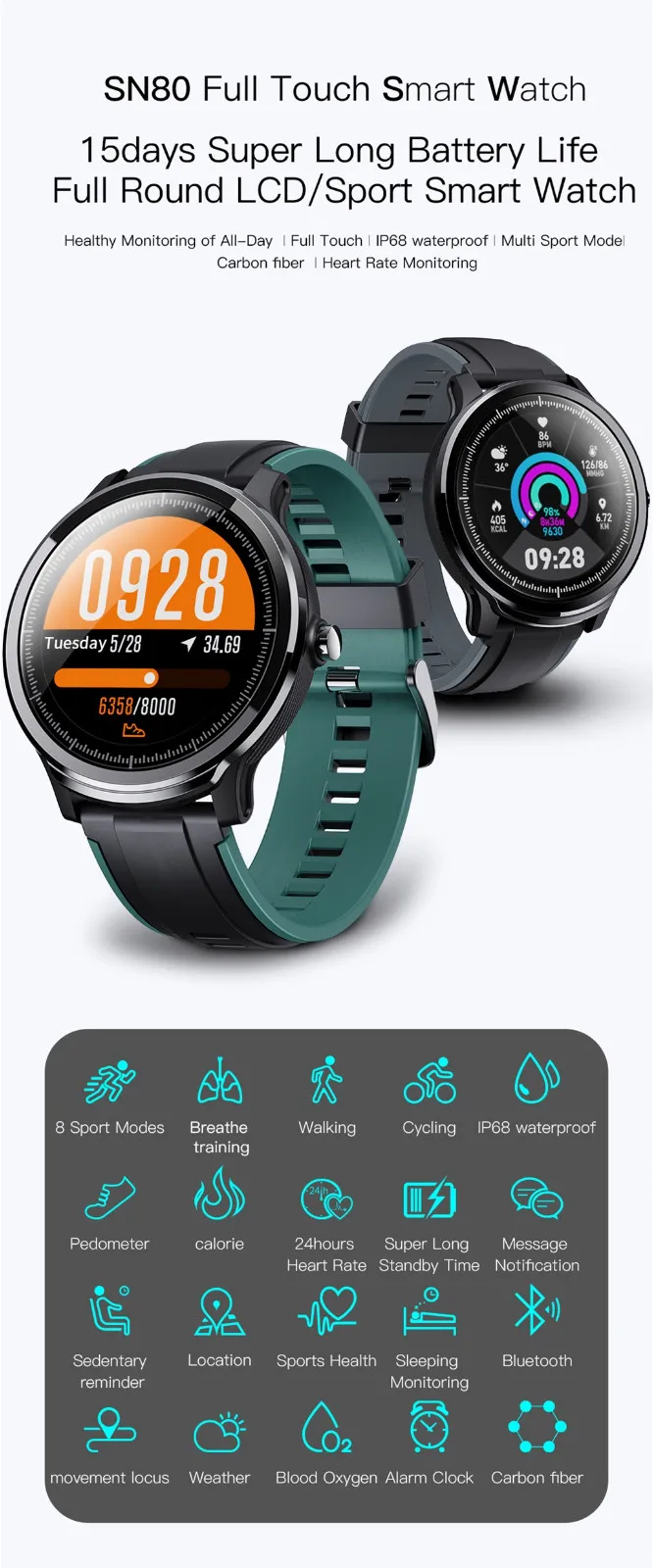 1. С помощью микросхем с низким энергопотреблением для устранения боли в умных часах, SN80 используется для 15 дней и в режиме ожидания в течение 60 дней.