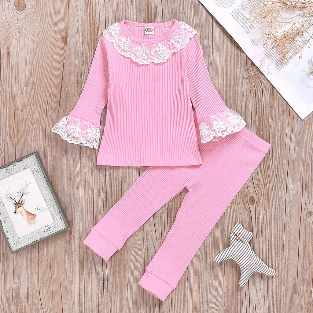 Однотонные кружевные топы с длинными рукавами для новорожденных мальчиков и девочек, комплект из рубашки и штанов