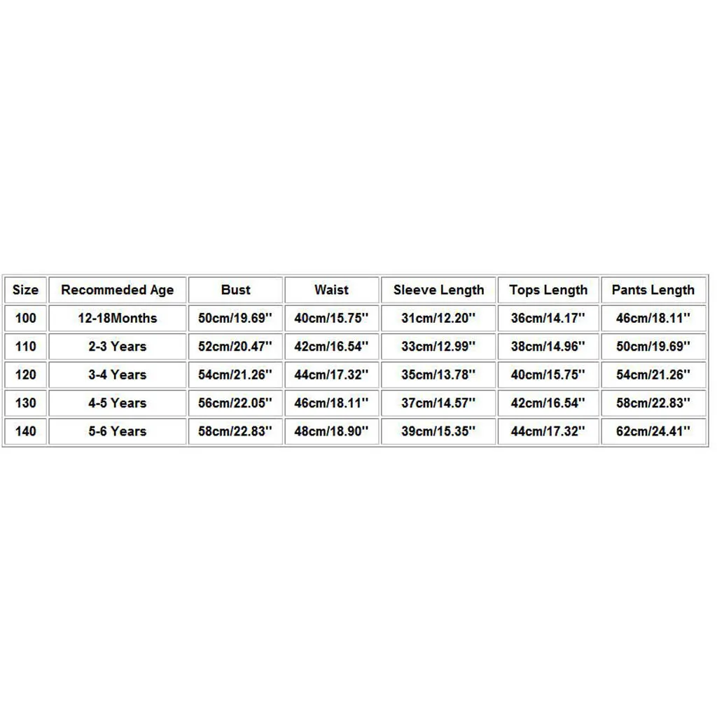 Размер Рекомендуемый возраст Обхват груди Обхват талии Рукав Длина Топы Длина Брюки Длина 100 12-18Months 50 см/19,69'' 40 см/15,75'' 31 см/12,20'' 36 см/14,17'' 46 см/18,11'' 110 От 2 до 3 лет 52 см/20,47'' 42 см/16,54'' 33 см/12,99'' 38 см/14,96'' 50 см/19,69'' 120 От 3 до 4 лет 54 см/21,26'' 44 см/17,32'' 35 см/13,78'' 40 см/15,75'' 54 см/21,26'' 130 От 4 до 5 лет 56 см/22,05'' 46 см/18,11'' 37 см/14,57'' 42 см/16,54'' 58 см/22,83'' 140 От 5 до 6 лет 58 см/22,83'' 48 см/18,90'' 39 см/15,35'' 44 см/17,32'' 62 см/24,41''