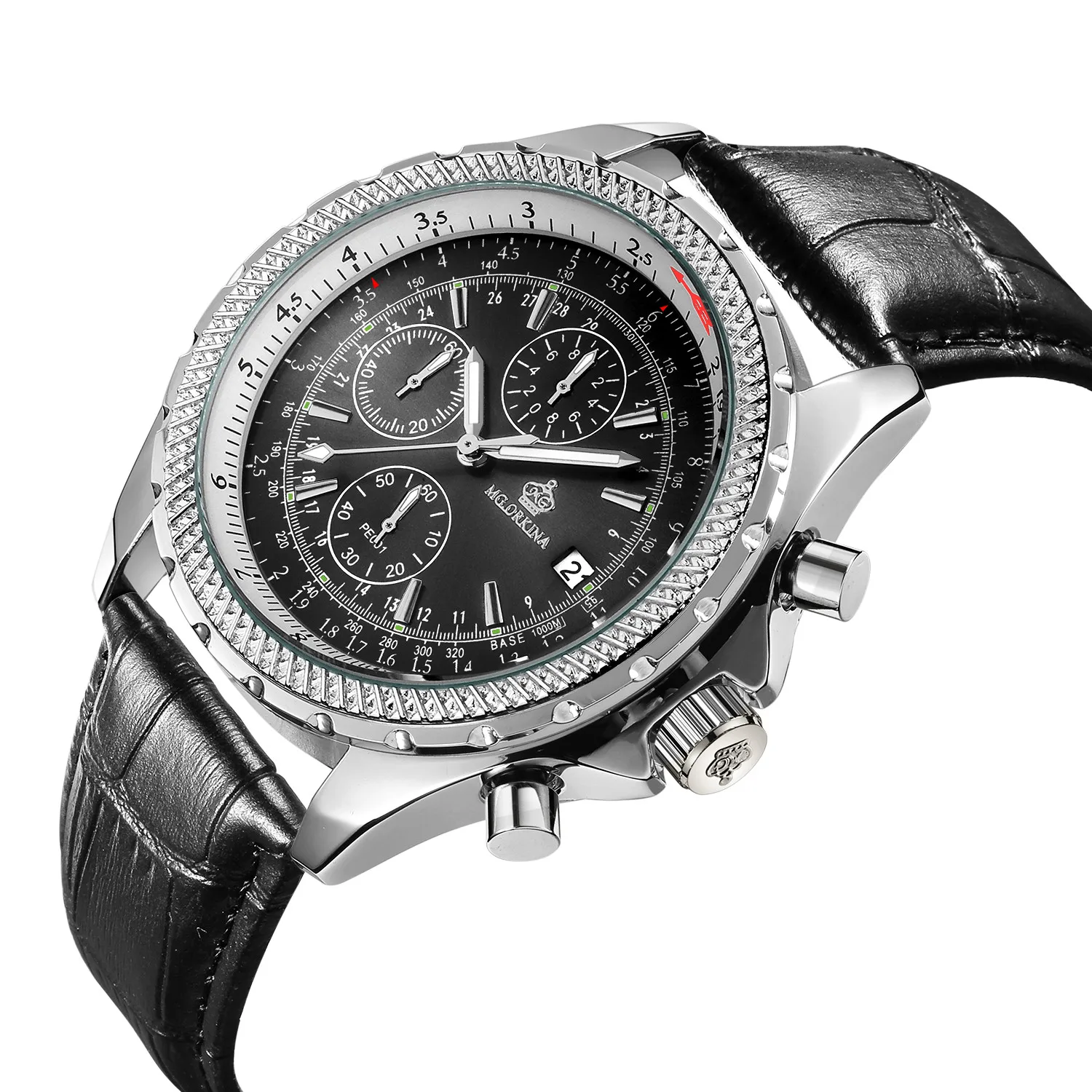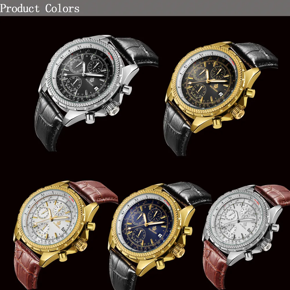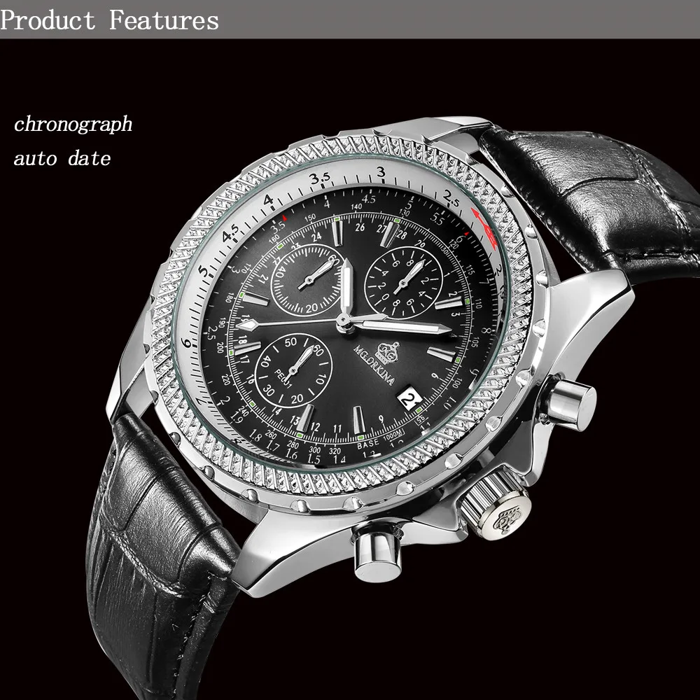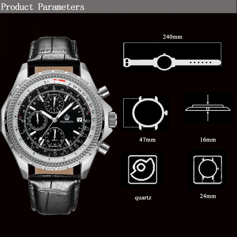 Размеры: Размер корпуса часов: approx.47 мм Ширина ремешка часов: около 24 мм Чехол Толщина: Approx.16mm Длина Часов: около 240 мм (1 см = 10 мм = 0,394 дюйма) Особенности: Хронограф Автоматическая Дата Тепло Примечания: Эти часы Водонепроницаемость в повседневных условиях. (не для купания, душа или плавания)