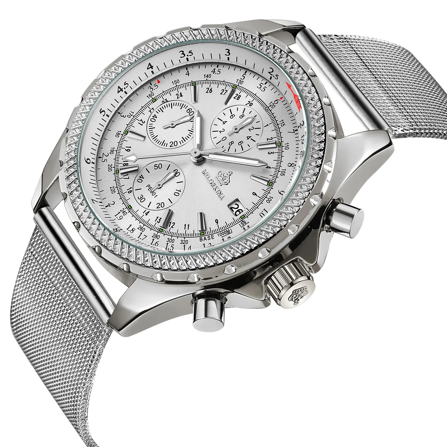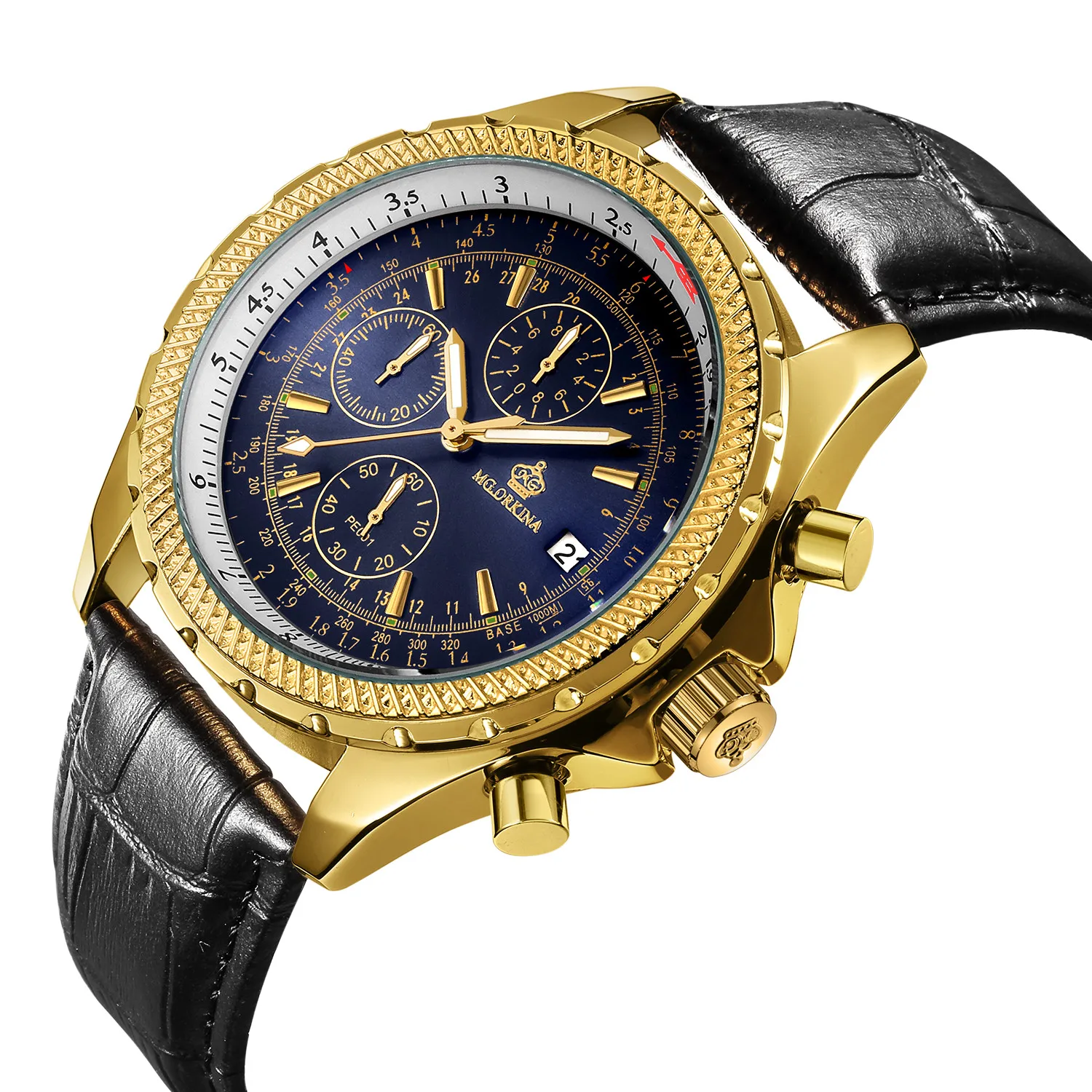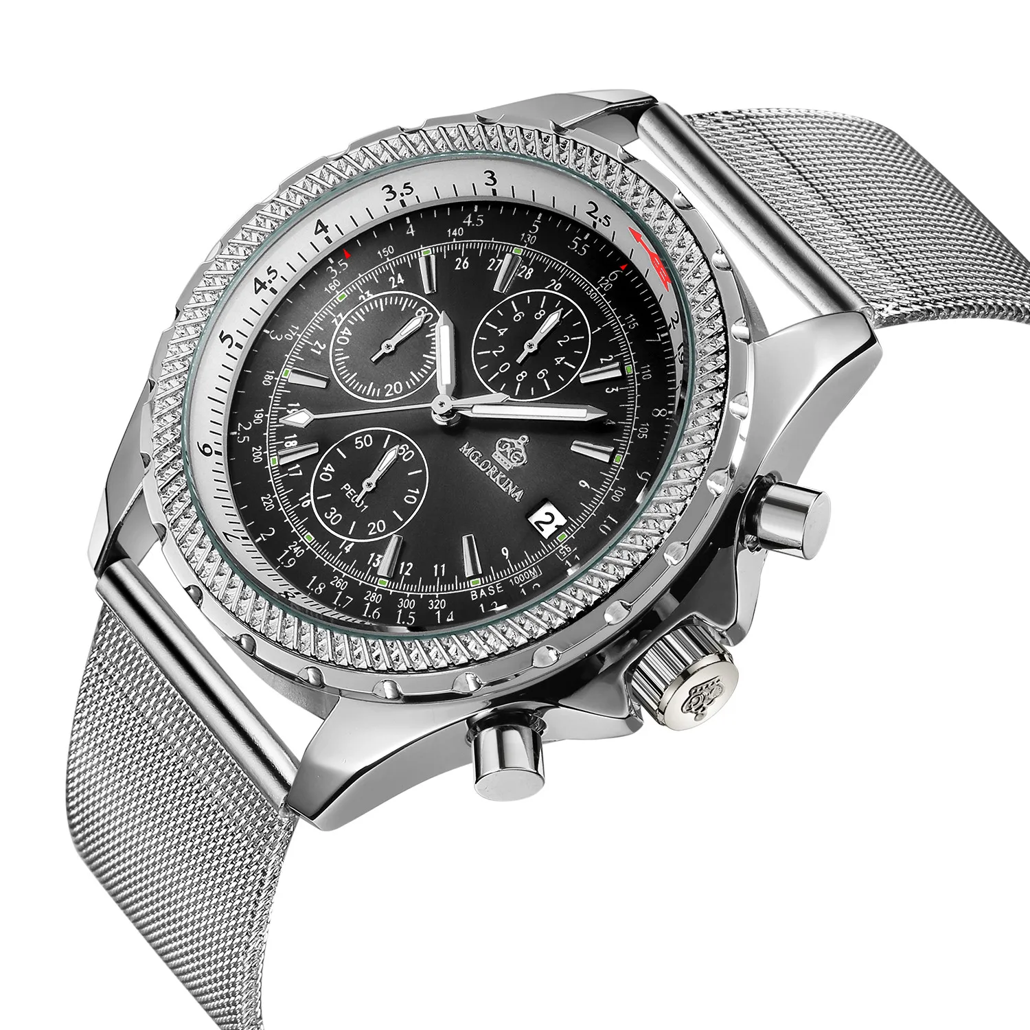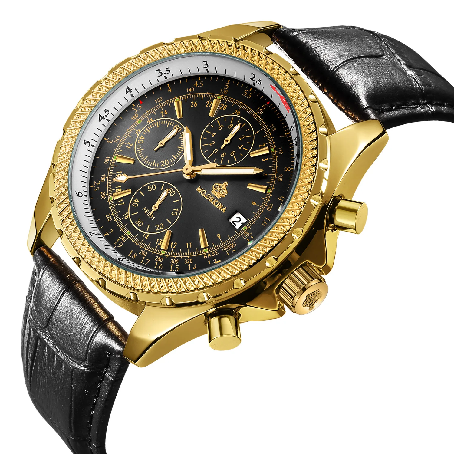 Размеры: Размер корпуса часов: approx.47 мм Ширина ремешка часов: около 24 мм Чехол Толщина: Approx.16mm Длина Часов: около 240 мм (1 см = 10 мм = 0,394 дюйма) Особенности: Хронограф Автоматическая Дата Тепло Примечания: Эти часы Водонепроницаемость в повседневных условиях. (не для купания, душа или плавания)