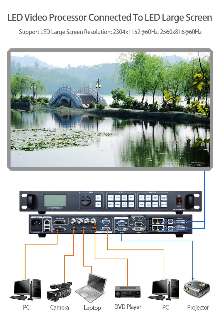 Более канальный видео вход-светодиодный видеопроцессор 8/9-канальный видео вход, 1 DP,1 DVI, 2 HDMI, 2AV(CVBS),2 VGA, 1 3G-SDI или 1 USB (расширение); В основном охватывает гражданских и промышленных Используется. Переключение всех видео входов позволяет быстро резать и выцветать переходы. Практичные интерфейсы видеовыхода-процессор имеет три видеовыхода s. 2 видеовыхода с использованием Два выхода DVI, включая выход VGA и выходы DVI, имеют один выходной разъем. После Эти три видео запрограммированы, чтобы отправить выход на светодиодный-карту или монитор. Видео DVI1 Выход распределения (выход петли), в многомашинном соединении очень практичный, устраняя использование Видео дистрибьютор, экономя пользователю утомительные соединения, уменьшая скорость сбоя подключения