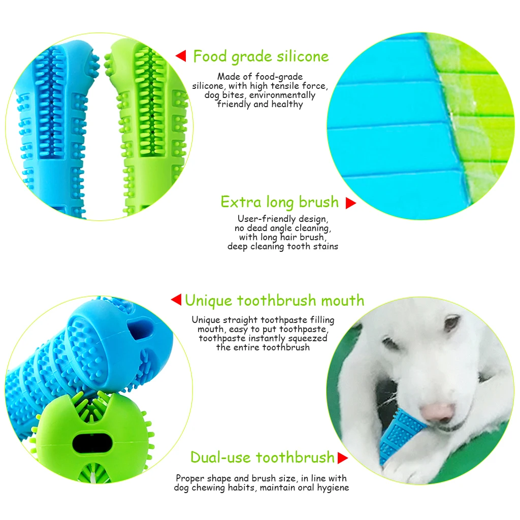 Зубная щетка doggy 360, как кость, эта собачья щеточная палочка покрывает щетинками с четырех сторон. Вы можете вдавить собачья зубная паста в верхнее отверстие, затем зубная паста будет вытекать из 20 маленьких отверстий. Его уникальный дизайн самостоятельно распределяет зубную пасту во время игры, чтобы сделать чистку зубов собак ветерком.