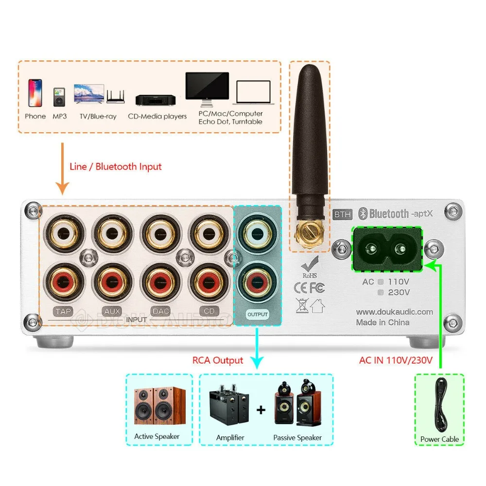 С 4-полосная стерео RCA и Bluetooth 5,0 (APT-X LL) вход переменного тока, достижения более быстрая и стабильная передача andcompatible с различных аудиоустройств, таких как мобильный телефон, компьютеров, плееров, декодеры, AV, машины, cd-проигрыватели, телевизоры, телеприставки, MP3 и так далее.