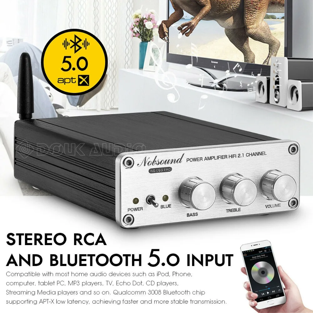 2,1 канал и 300 Вт Выход: Максимальная мощность может достигать 75 Вт * 2 (левый/правый канал) + 150 Вт (сабвуфер), без звукового шума даже при высокой выходной мощности, И по умолчанию источник питания 24 В/6A, который достаточно для большинства домашних книжных полок/компьютеров/настольных/наружных/напольных пассивных динамиков.