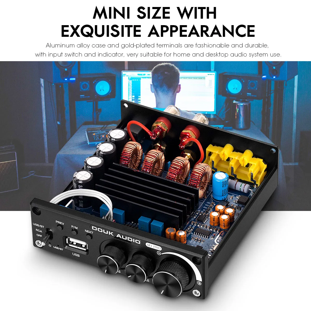 Мини-размер с изысканным внешним видом, чехол из алюминиевого сплава и позолоченные клеммы являются модными и прочными, с входным переключателем и индикатором, очень подходит для домашнего и настольного использования аудиосистемы.