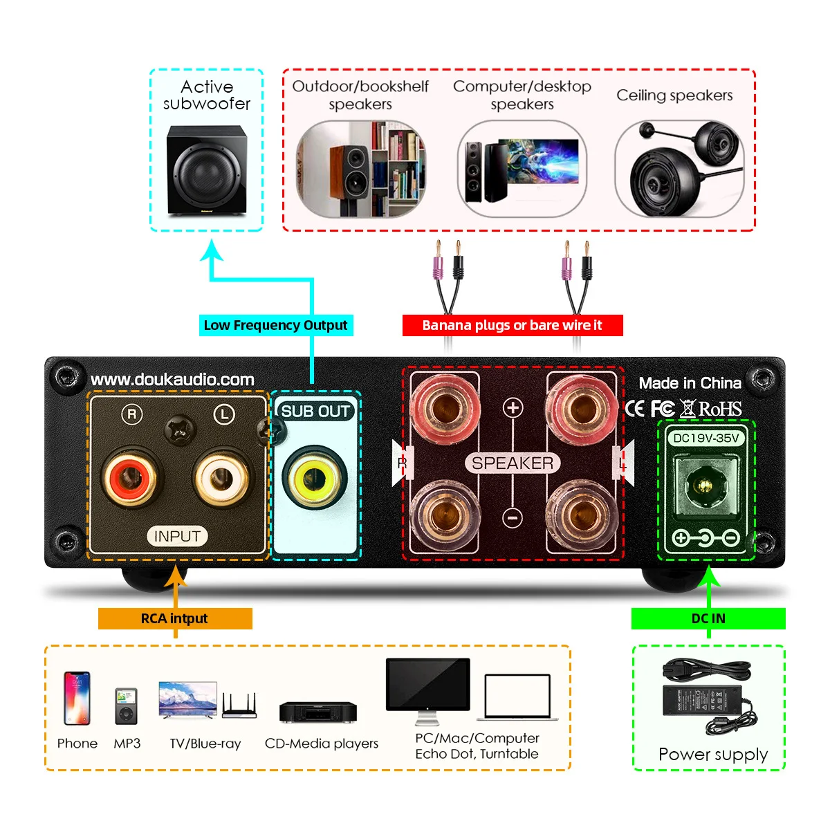 Используя классический чип TDA7498E, максимальная выходная мощность может достигать 160 Вт + 160 Вт, оснащен высококачественным источником питания 32 В/5A, достаточным для привода более 300 Вт пассивных динамиков. Он хорошо сочетается с напольными/Книжными Полками/компьютером/настольным компьютером/потолком/напольными колонками.
