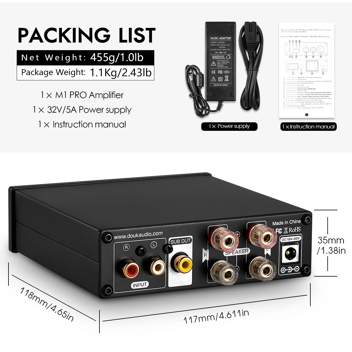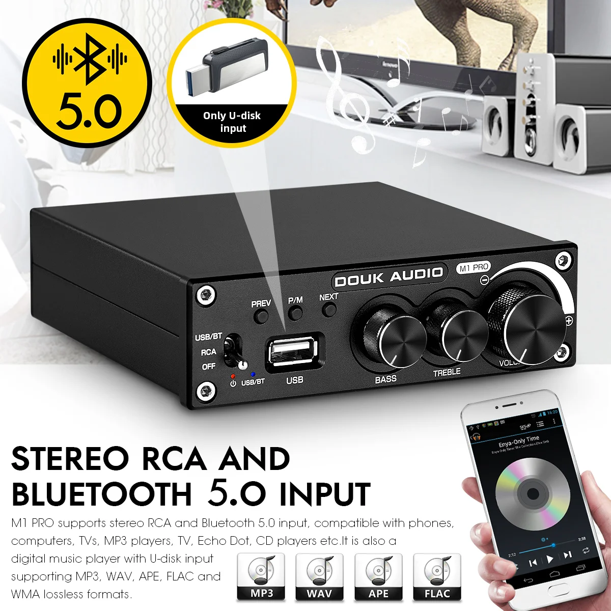 M1 PRO поддерживает стерео RCA и Bluetooth 5,0 вход, совместим с телефонами, компьютерами, телевизорами, mp3-плеерами, TV, Echo Dot, cd-плеерами и т. д. Это также Цифровой музыкальный плеер с u-дисковым входом, поддерживающим форматы MP3, WAV, APE, FLAC и WMA без потерь.
