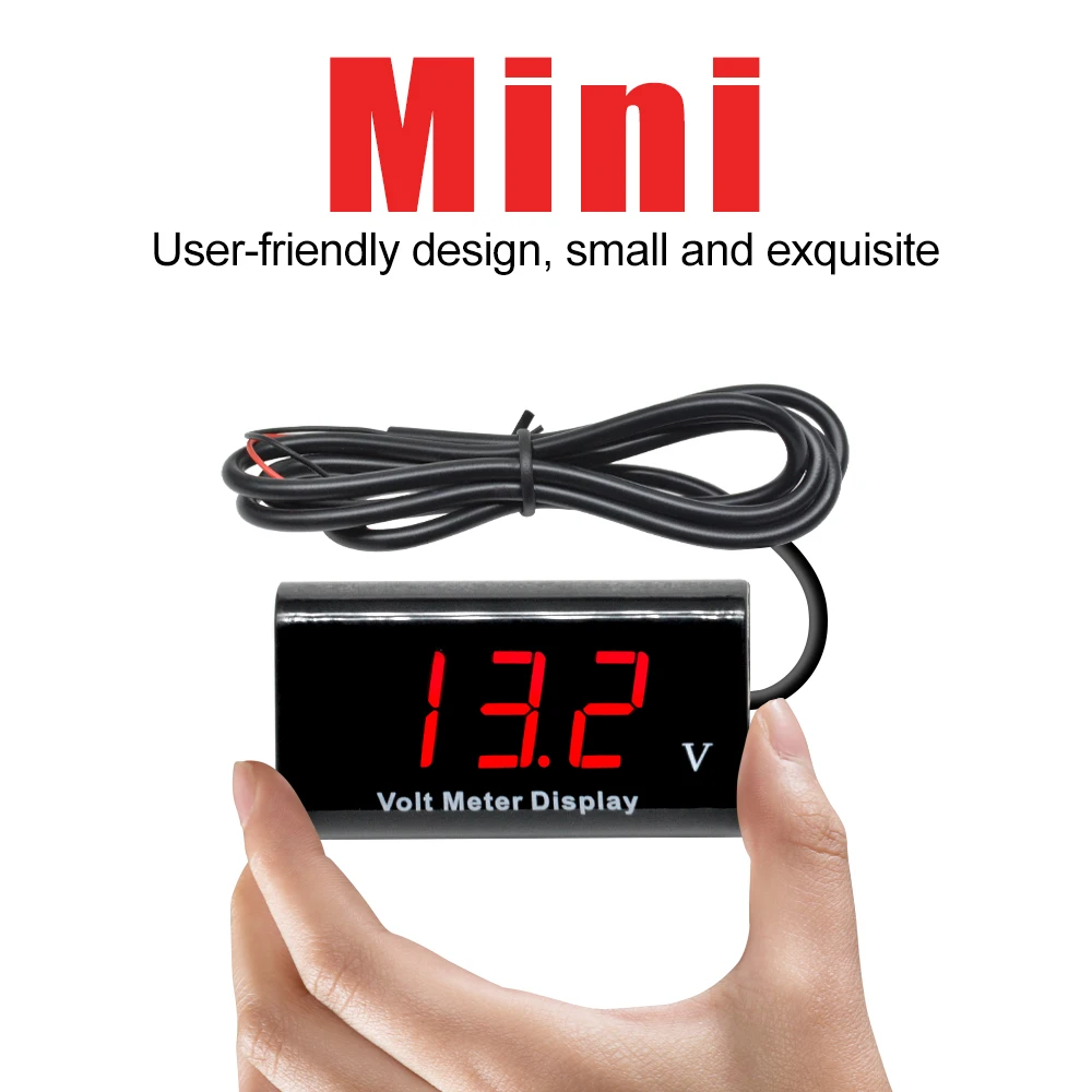 1. Этот вольтметр имеет полностью закрытый корпус, замоченный в воде в течение короткого периода времени и может нормально работать без повреждений. 2. Вольтметр небольшой по размеру и отображается тремя 0,56 дюймовыми светодиодный-цифровыми трубками. 3. Двухпроводная Проводная система, простая проводка; Прямое измерение, отсутствие внешнего дополнительного источника питания. 4. Этот вольтметр может использоваться для обнаружения напряжения батареи в мотоциклах, автомобилях и т. д., а также для определения состояния батареи во времени. Размер изделия: 56 мм * 31 мм * 13,5 мм Точность измерения: ± 1 в Диапазон напряжения: 8-18 в Длина линии: 100 см Режим питания: две линии постоянного тока Режим отображения три: 0,56 "светодиодный цифровой трубка Водонепроницаемость: IPX6 Материал корпуса: АБС-пластик Способ подключения: Красная линия подключения "+"; Черная линия подключения "-" Примечание: 1. Напряжение источника питания, используемое в этом вольтметре, не должно быть выше 12 В. Пожалуйста, обратите внимание на таблицу, чтобы избежать остаточного повреждения вольтметра из-за искры двигателя, пульсации источника питания или другого чрезмерного резкого напряжения. 2. Поскольку этот вольтметр использует светодиодный дисплей, он требует определенного рабочего тока, поэтому он не может использоваться для измерения высокого внутреннего сопротивления напряжения, например, низкого напряжения сигнала и аккумулятора кнопки. 3. Обратите внимание на метод подключения, красная линия положительная, черная линия отрицательная, и она не может быть изменена.Тип 2: