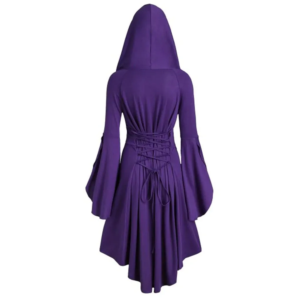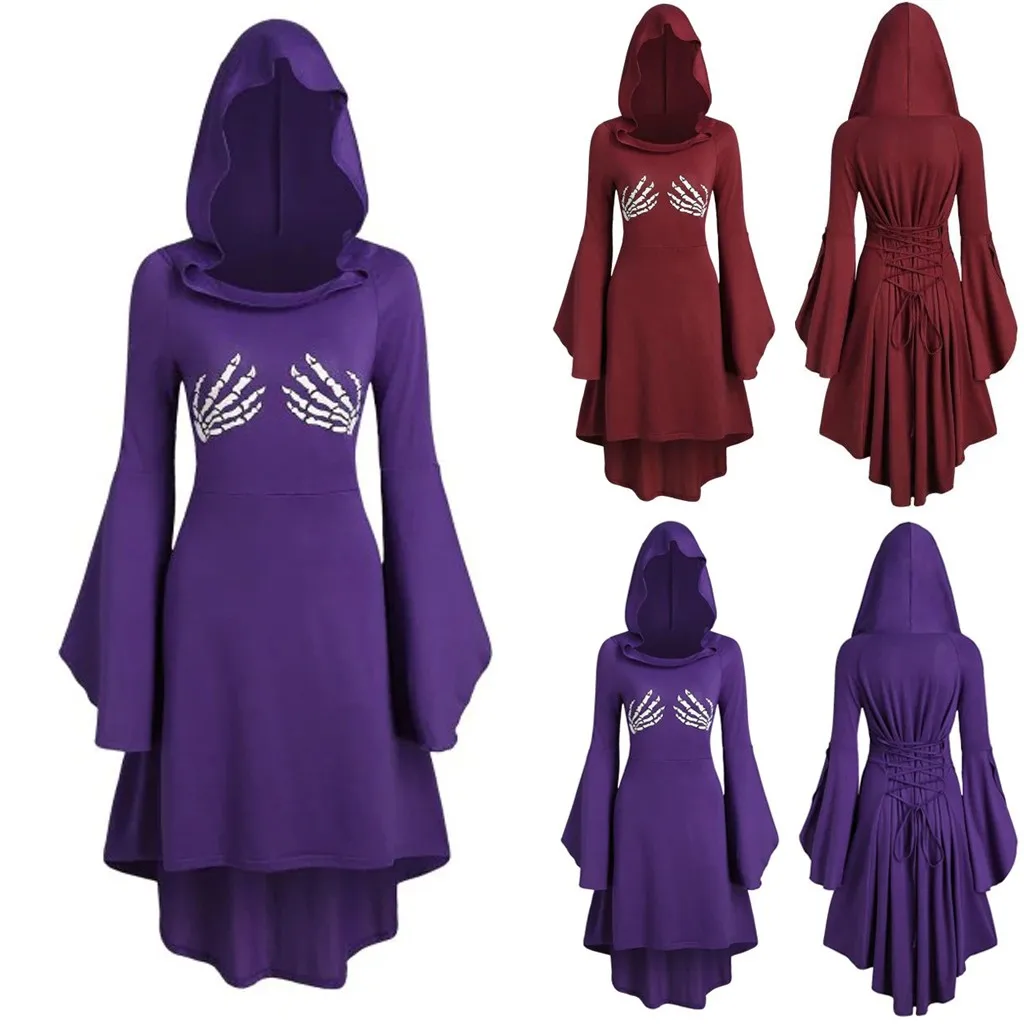 Мода женщин с длинным рукавом скелет печати кружева Хэллоуин с капюшоном миди платье