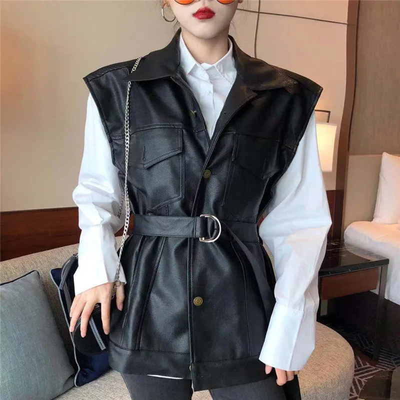 Rurouisbeir 2019 новый осенне-зимний женский винтажный Повседневный жилет из искусственной кожи с карманами и поясом