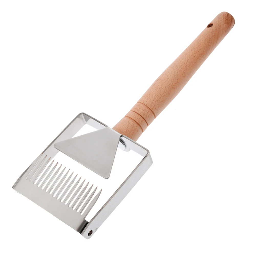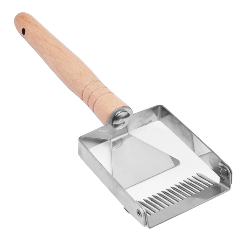 Медовый скраппер изготовлен из нержавеющих жестяных пластин и гладкой деревянной ручки.