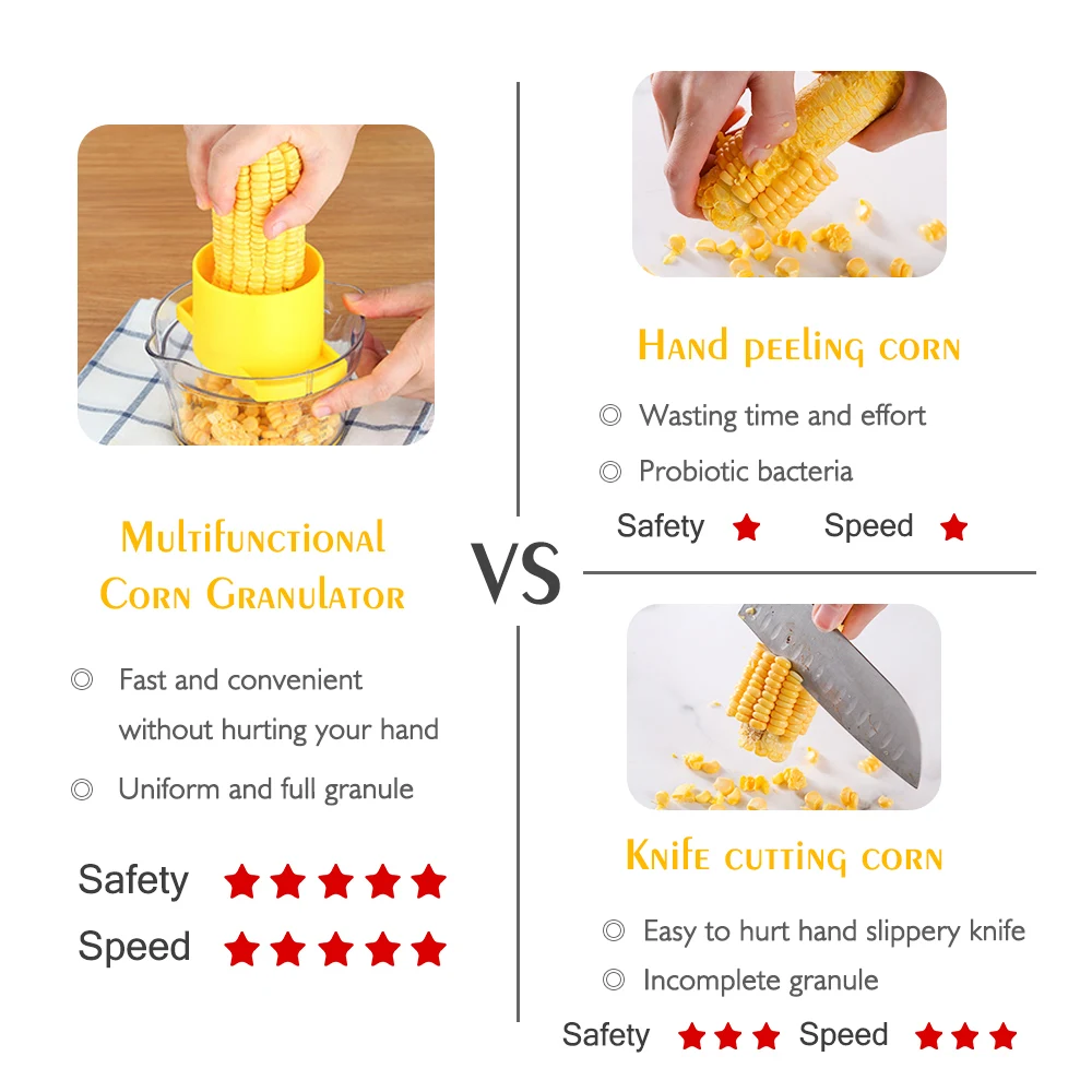 Он гигиеничен, оснащен специальным контейнером, может держать кукурузные зерна, и держать продукты более санитарными и безопасными. Можно нарезать имбирь, чеснок, сыр и картофель. Идеальное сочетание. Безопасность, с защитой безопасности нажмите, чтобы нажать конец, не беспокойтесь, что рука коснется лезвия. Это многофункциональная Кукуруза Овощечистка, вы можете быстро очистить кукурузу.