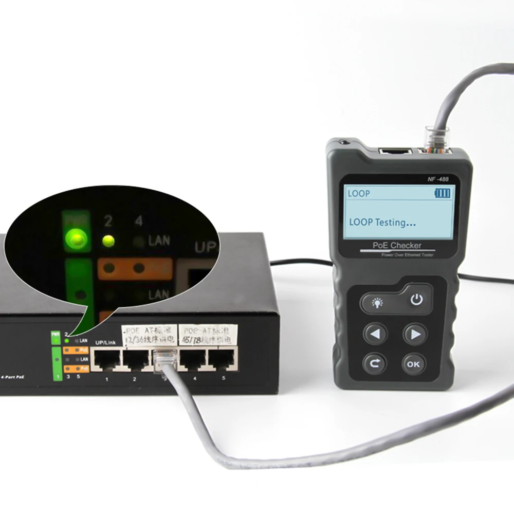NF-488 PoE checker состоит из двух частей: эмиттера и пульта дистанционного управления. Он имеет такие функции, как стандартное и нестандартное Обнаружение PoE оборудования, онлайн-тест питания PoE, тест на непрерывность сетевого кабеля, тест питания постоянного тока, тест на обратную связь с переключателем и другие функции. Таким образом, он идеально подходит для мониторинга безопасности, проводов связи, интегрированной проводки и других систем слабого тока.