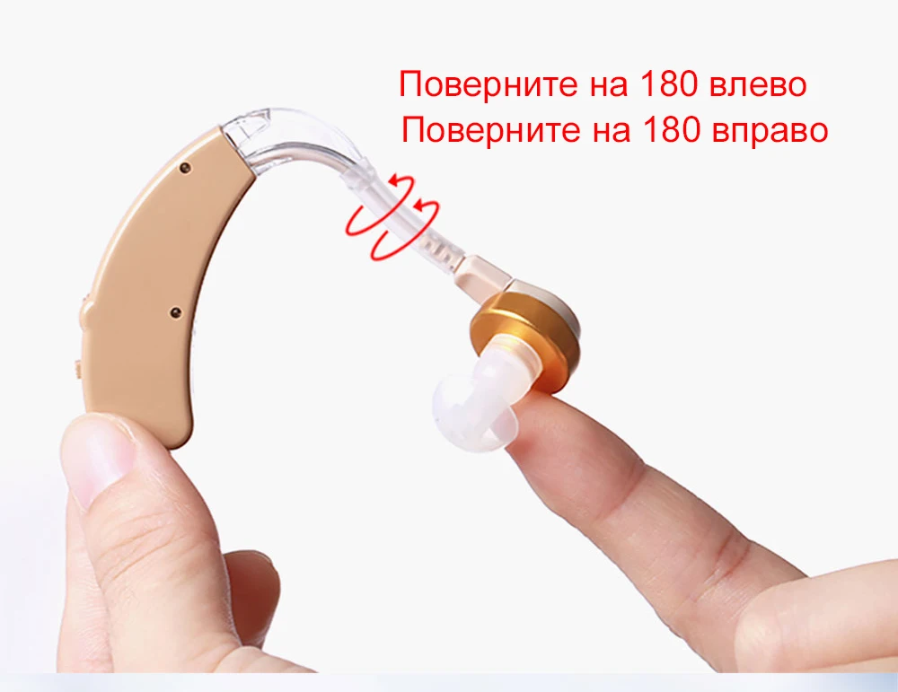 1. Выберите подходящий наушник 2. Подключение к питанию 3. Включите 4. Регулировка громкости 5. Поворот на 180 ° до R/L 6. Регулировка слухового аппарата делает его подходящим