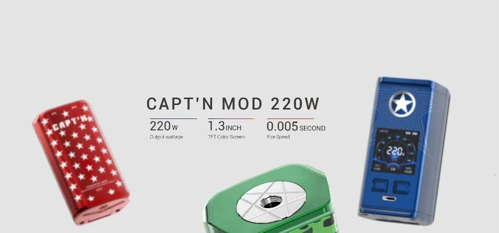 Мод Capt'n, разработанный для бесконечного аромата, является мощным и инновационным модом 220 Вт TC. Мод Capt'n, работающий от двух аккумуляторов 18650, с рамой из цинкового сплава и корпусом панели IML, поддерживает стабильные и высокопроизводительные режимы VW/TC, Скорость Огня 0,005 S. Вместе с 1,3-inchTFT цветной экран.