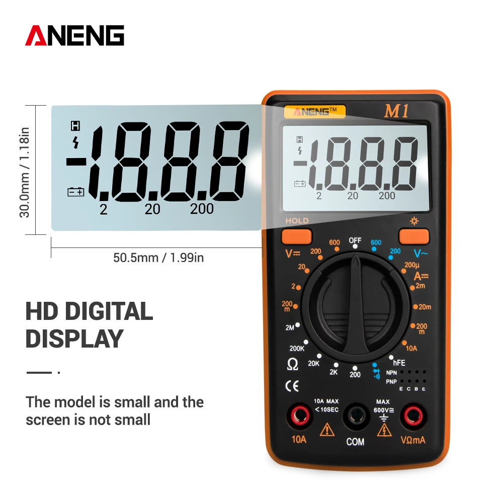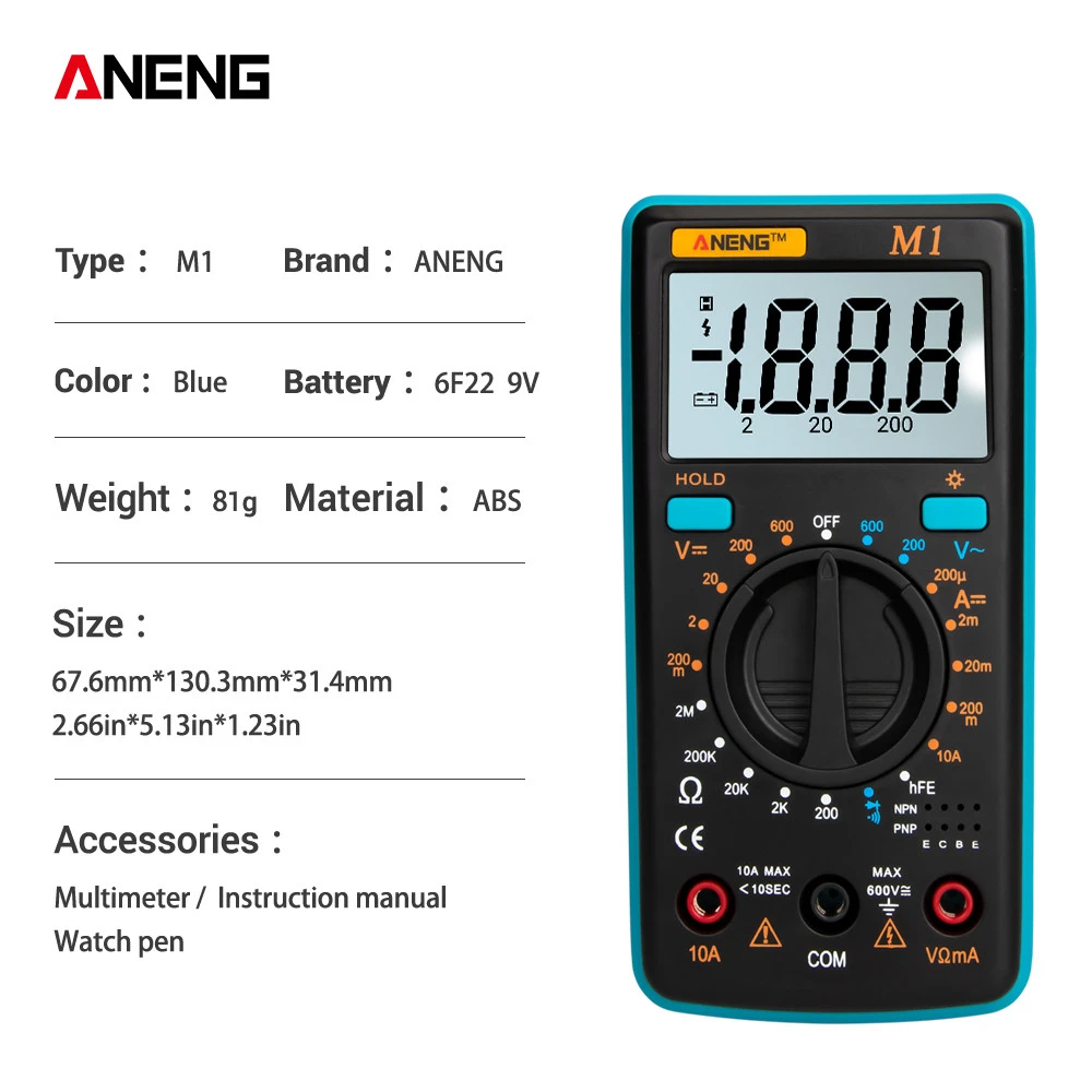 Широкое использование-автоматическое измерение. Точно измеряет, например, напряжение и ток переменного/постоянного тока, сопротивление, непрерывность, диод, емкость, частоту/рабочий цикл, температуру, транзистор и испытание на непрерывность с помощью аккумулятора.