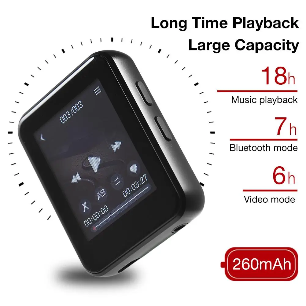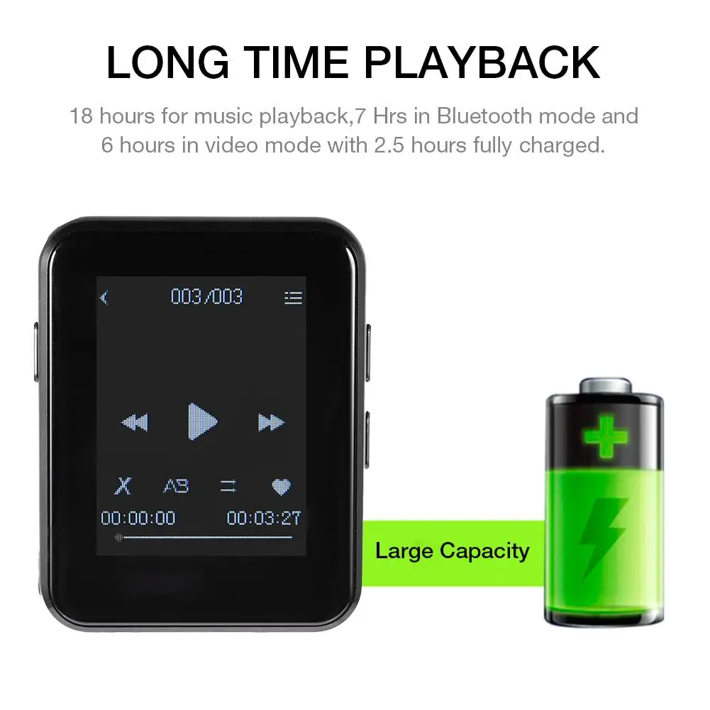 5, долгое время воспроизведения и большой Ёмкость: 18 часов воспроизведения музыки, 7 часов в режиме Bluetooth и 6 часов в режиме просмотра видео с 2,5 часов при полной зарядке. Может быть встроен в разнообразную внутреннюю память, плеер предлагает много места для ваших песен и книг.