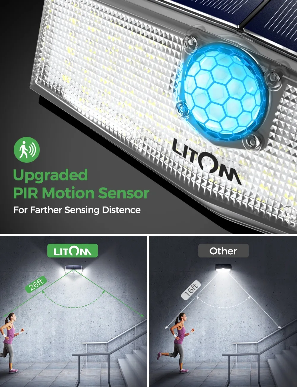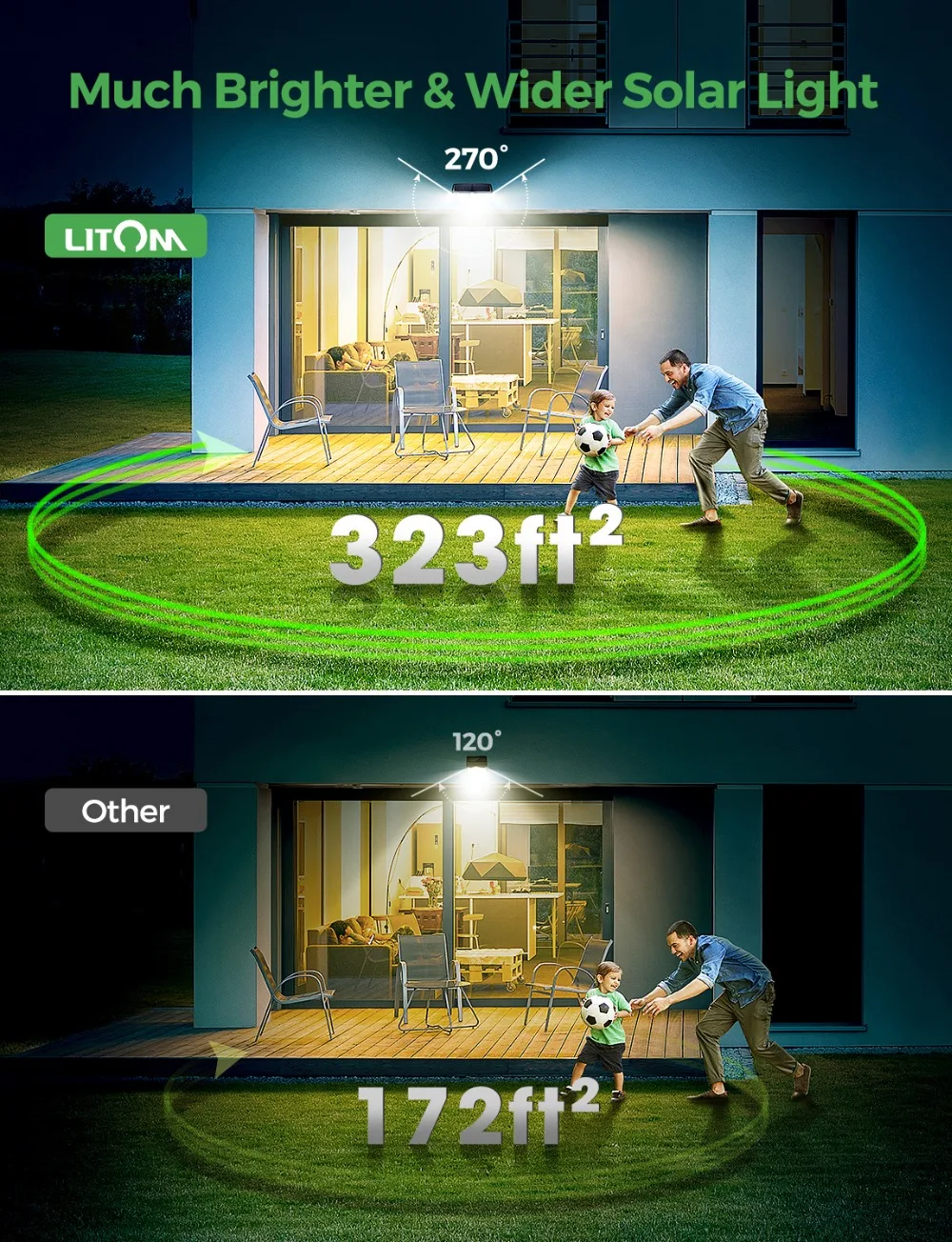 【Супер яркий светодиодный Chips】С 120 передовым светодиодный светильник s и 270 ° широкоугольной конструкции, светильник датчик движения LITOM обеспечивает гораздо ярче светильник ing и более широкий диапазон обнаружения, чем другие аналогичные открытый солнечный светильник s на рынке.