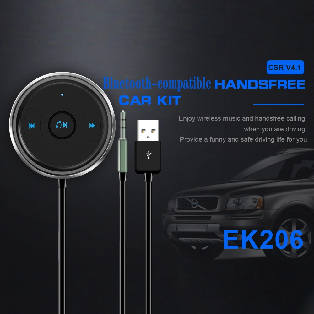 Description: The EK206 is a Bt multi-functional car speakerphone.1. Exclusive patented car Bt audio adapter;2.Using UK imported CSR4.1 high-end chip, the transmission is more stable, and has noise reduction function; let you enjoy the quality of the call and enjoy high-quality music3. Support SIRI voice assistant function, one-button hands-free phone, to solve the trouble of driving by telephone;4. Listen to wireless music online to bring you driving pleasure.5. Instantly change the normal speaker to a Bt speaker and enjoy life easily.6. Support all kinds of mobile navigation software, allowing you to easily navigate.7. USB power supply for you to solve the problem of battery life.Installation istructions:1.Plug 3.5mm jack into car's aux hole and plug usb jack into your car charge.2.Paste basement on your car, and put EK206 on basement.3.Open the Bt searching function of your mobile or other bt device to find EK206 device, click it to finish connecting.4.After connecting successfully,then you cna enjoy your handsfree calling and wireless music.Specification:Bluetooth-compatible version: CSR4.1Support for hands-free callingSupport wireless musicSupports SIRI and Android voice assistance, one-button speakerphoneUSB power, never power off.Frequency: 2402MHz-2480MHzSignal to noise ratio: >95dBOperating distance: 10 meters (barrier-free)Battery capacity: 100 mA / 3.7 VOperating Environment: -10 to +50°CProduct size: 45*45*12 mmCable length: 120CM Package Includes:1 x Car hand free car kit1 x User Manual