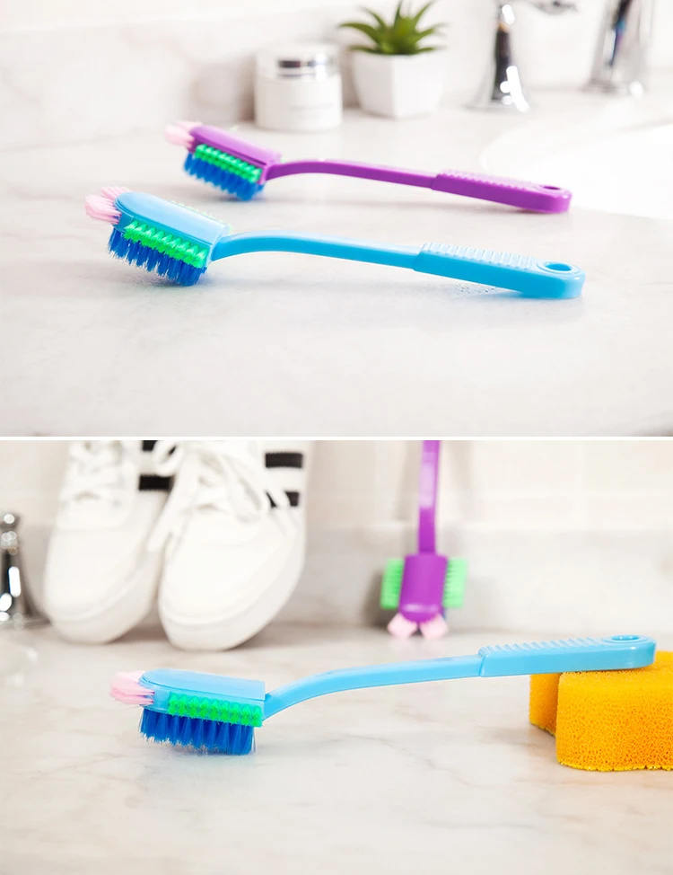 Широкие щетинки можно использовать для чистки верхней части, узкие щетинки можно использовать для чистки подошвы, а прорези также можно чистить.