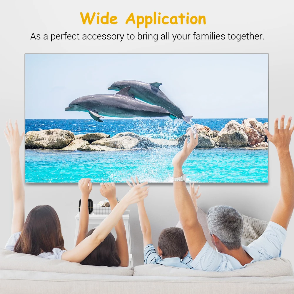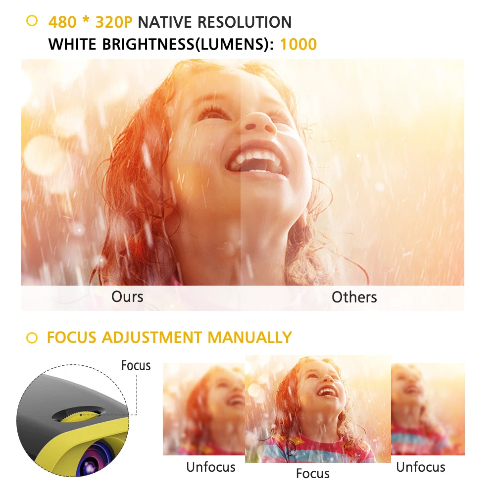 1000-lumen лампа, с высокой яркостью и красивым цветовым дисплеем, 480*320P родное разрешение, поддержка 1080P HD проигрывание, встроенный высококачественный стерео динамик, которые обеспечат вам удовольствие от визуального и слухового праздника; 4:3 и 16:9 выбор рациона, идеально подходит для игры, Смотрите фильмы или футбольные игры с семьей и друзьями.