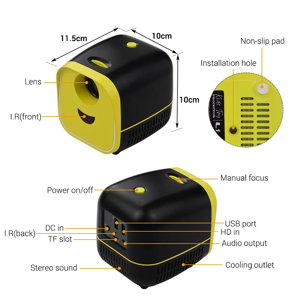 Этот проектор компактный и легкий, мини-размер и легко носить с собой; С нескользящими подушечками и винтовым отверстием на дне, можно разместить на столе стабильно или установить с другим кронштейном.