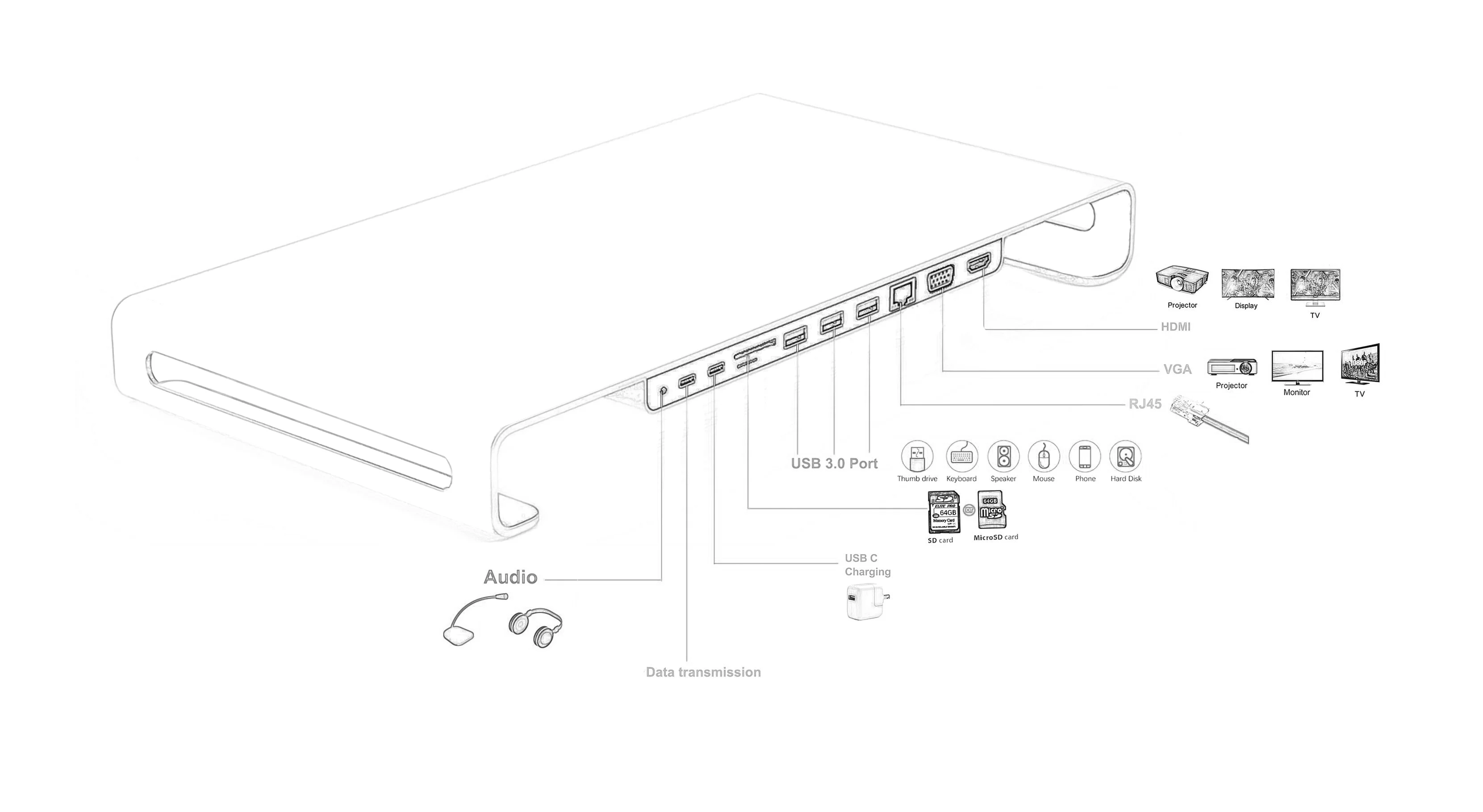 Подставка для монитора * 1 Ethernet RJ45 * 1 Аудио 3,5 мм * 1 Выход VGA * 1 Выход HDMI * 1 USB C data * 1 USB C PD * 1 SD / MICRO SD кард-ридер * 1 USB3.0-концентратор A * 3