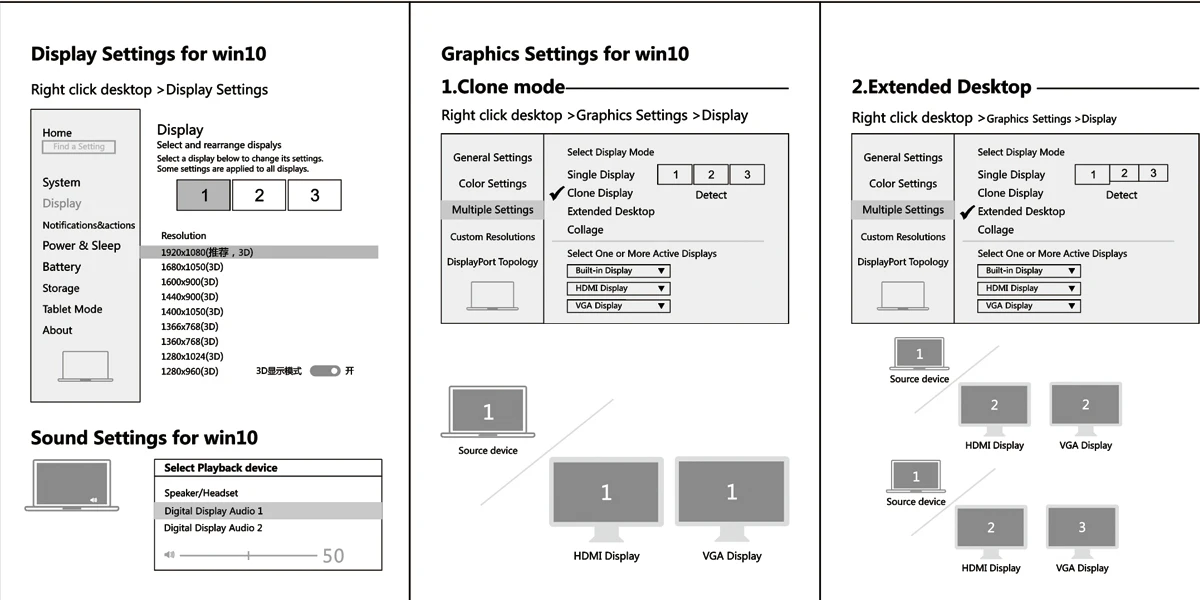 Настройка дисплея для Win 10 Нажмите на рабочий стол> Настройки дисплея Настройки графики для win 10 1. Режим клона --- Щелкните правой кнопкой мыши на рабочем столе> графическое изображение> Дисплей 2. Расширенный Рабочий стол --- Щелкните правой кнопкой мыши на рабочем столе> графические Настройки> Дисплей