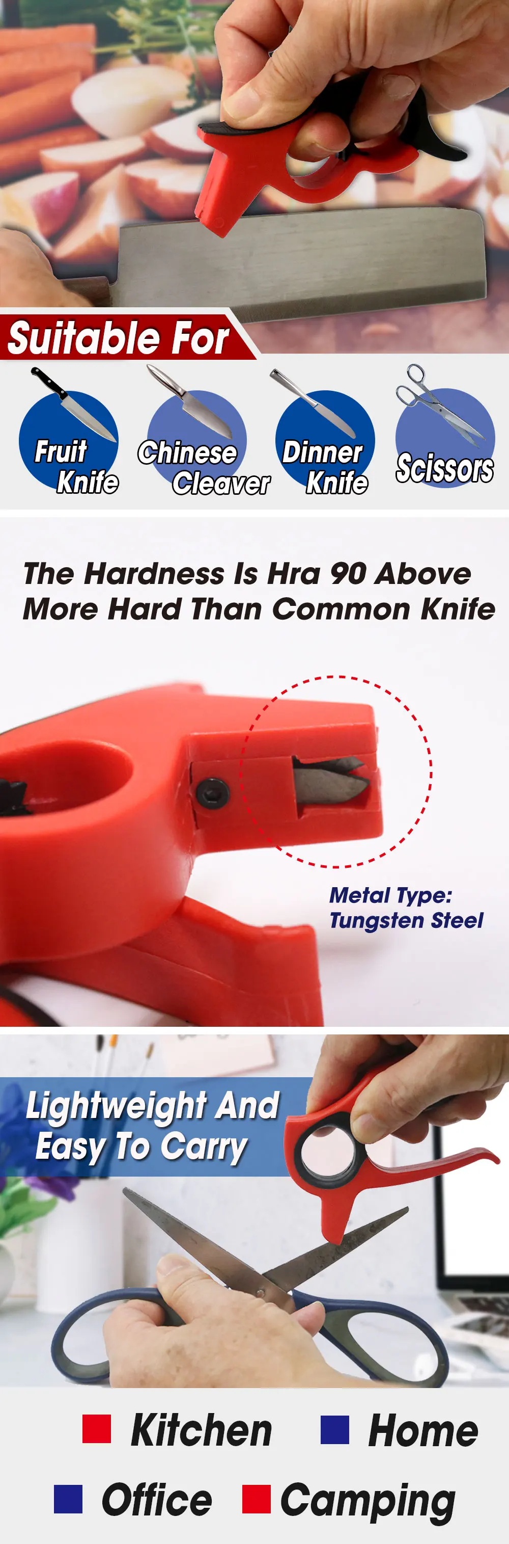 * Легко носить с собой и размер кармана. * Вольфрамовая сталь Hra более 90. * Костюм для офиса/кемпинга/кухни/дома. * Затачивание в секунду. * Сделано в Тайване.
