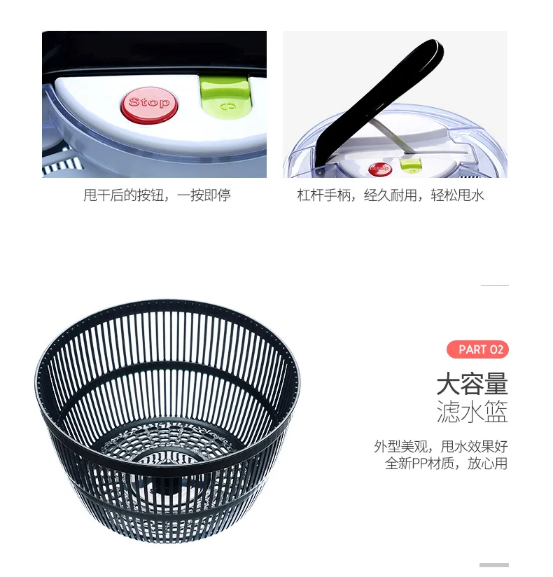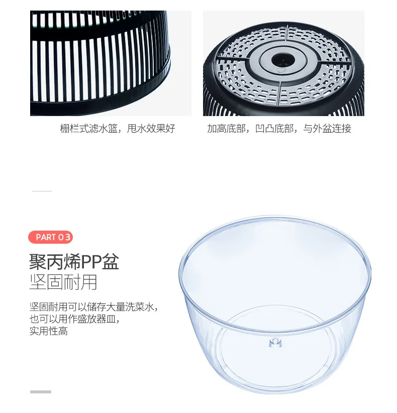 Отличный дизайн: широкое основание держит миску устойчивой на столешнице. Ваш верх надежно закреплен, когда вы крутите фрукты, овощи или салат. Корзинка? Можно использовать отдельно как дуршлаг. Элегантная, Прозрачная чаша идеально подходит при удвоении в качестве сервировочной чаши.