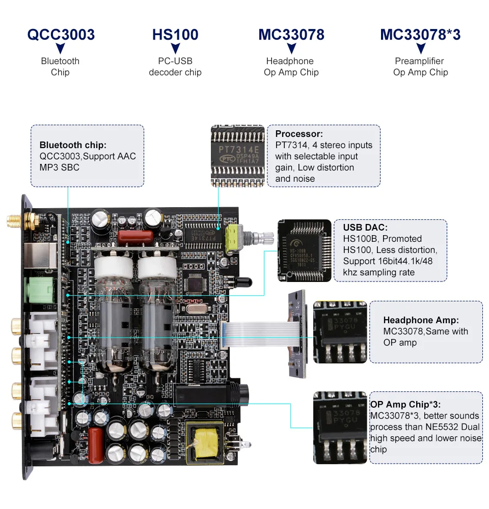 Чип-Архитектура: QCC3003 + HS100B + MC33078 + PT7314 + 6K4