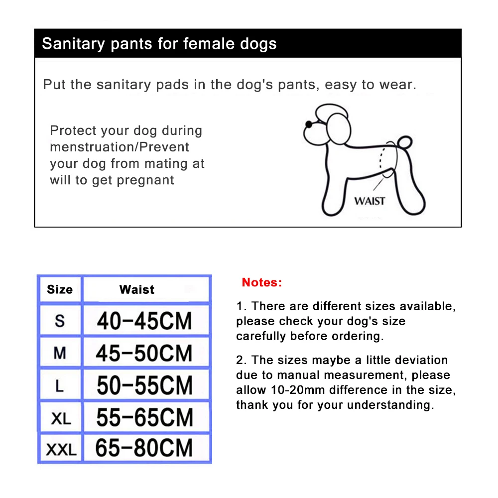 Санитарные брюки для собак-женщин. Он может эффективно защитить вашу собачку во время менструации, удерживая вашу собачку от грязи вашего пола, транспортного средства или мебели в его менструальный период, особенно для маленьких, которые не могут регулярно ходить в туалет. Изготовлен из тонкого качественного материала, мягкого, приятного для кожи и дышащего, безвредного для собак.