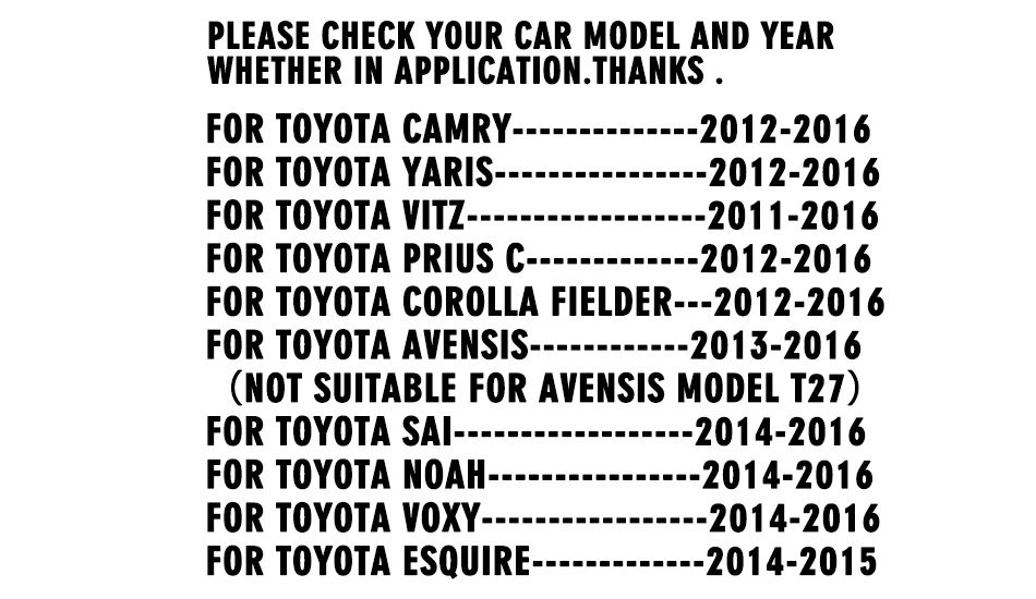 Параметры: Светодиодный Тип: 3528 SMD чипы Светодиодный Количество: 18 шт. * 2 Цветность света: белый Цвет света: 6000-6500 K Люмен: 270LM * 2 Напряжение: 12-30 в Цвет корпуса: чёрный Материал корпуса: Высокоплотный инженерный пластик Срок службы: более 50000 часов Применение: Для Toyota Camry ------------- 2012-2016 Для Toyota Yaris --------------- 2012-2016 Для Toyota Vitz ------------------ 2011-2016 Для Toyota Prius C-------------2012-2016 Для Toyota автомобиль corolla fielder --- 2012-2016 Для Toyota Avensis ------------ 2013-2016 (не подходит для модели avensis t27) Для Toyota SAI------------------2014-2016 Для Toyota Noah ---------------- 2014-2016 Для Toyota Voxy ---------------- 2014-2016 Для Toyota Esquire ------------ 2014-2015 Посылка включает в себя: 2 * Светодиодный фонарь номерного знака