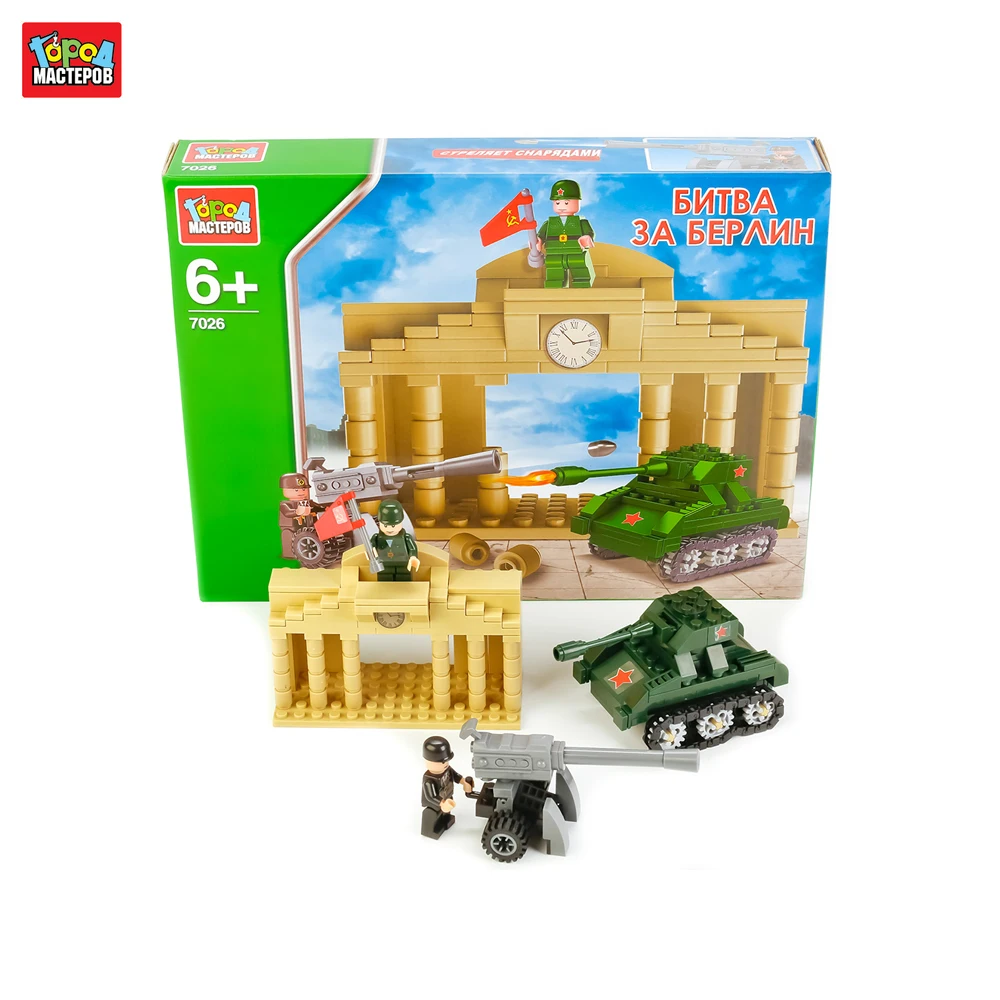 КОНСТРУКТОР "ГОРОД МАСТЕРОВ" БИТВА ЗА БЕРЛИН, С ФИГУРКАМИ. Конструктор "Битва за Берлин" совмещает в себе две функции: ребёнок строит танк с маленькой башенкой, пушку и похожую на Рейхстаг арку, на которую возводят советский флаг, и играет с ними, моделируя разные сюжеты. В наборе представлено 255 деталей ярких цветов, окрашенных стойкими к истиранию безопасными красителями и оснащённых удобными блочными креплениями. В комплект входят фигурки военных, которые делают игру интереснее и реалистичнее. Конструктор сделан из прочного, безопасного, яркого пластика.
