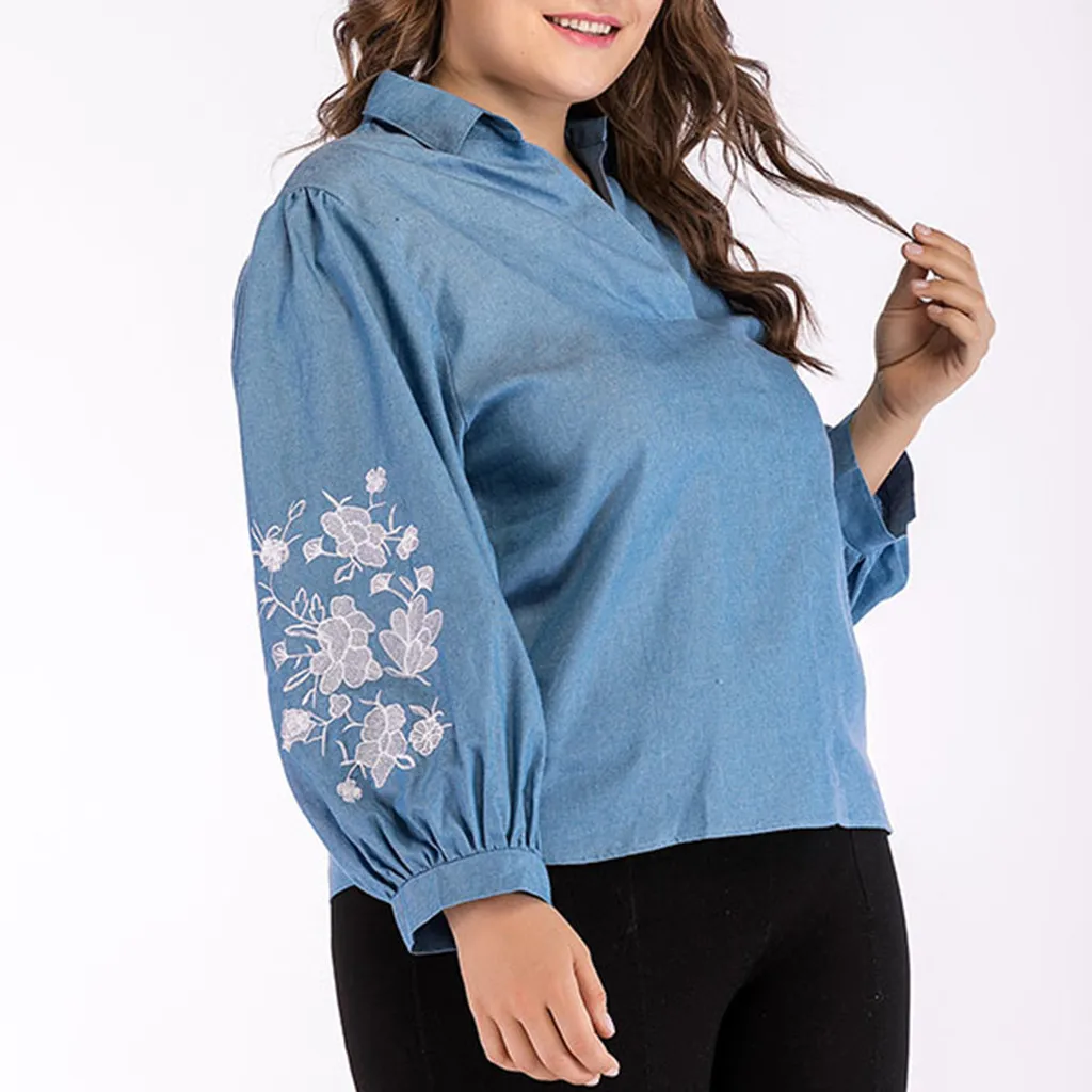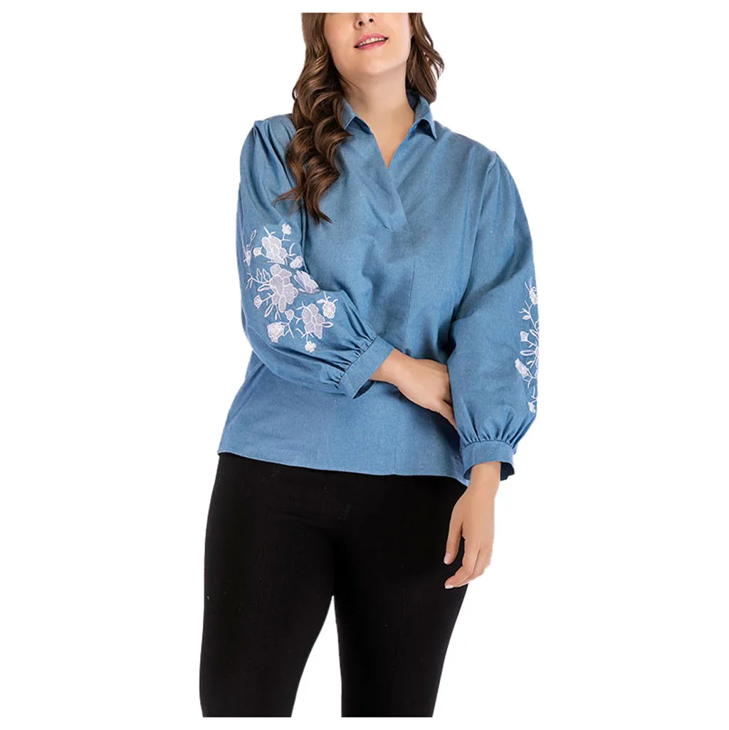 Женская Повседневная футболка размера плюс с вышивкой с длинным рукавом и v-образным вырезом