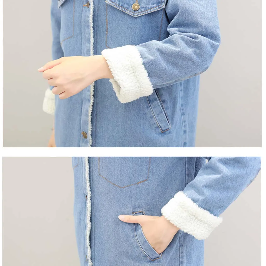 Зимняя женская синяя джинсовая утепленная куртка, флисовое джинсовое пальто, длинная верхняя одежда в стиле панк