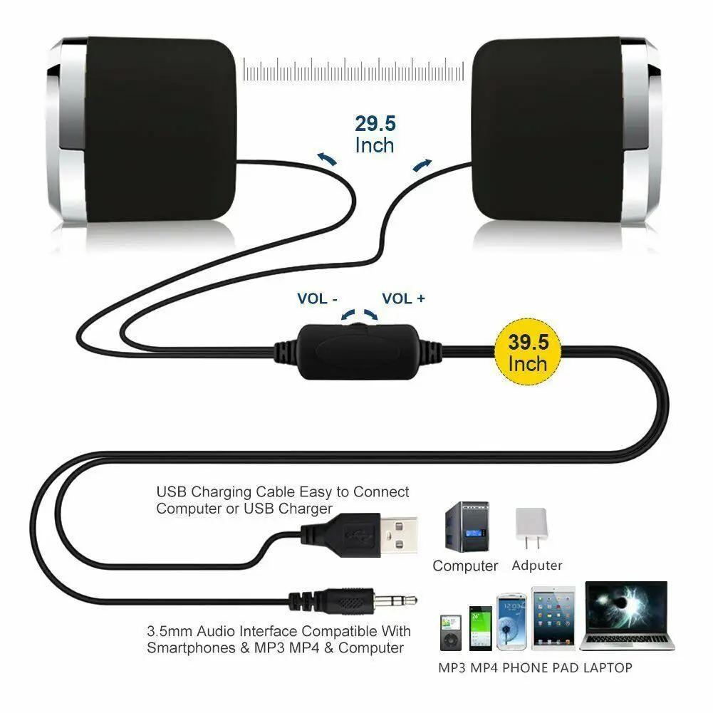 Использование с несколькими устройствами: подключайте устройства, usb-подключение очень просто. Встроенный usb-кабель быстро подключается без специальных драйверов, маленькие компьютерные колонки имеют разъем AUX для подключения к проигрывателю MiniDisc, mp3-плееру, iPod, мобильному телефону и любому другому AUX разъему-оборудованию мобильный мультимедийный плеер.