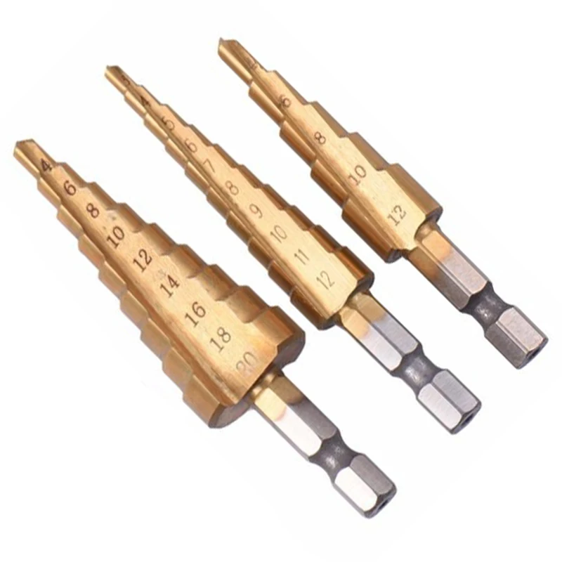 Акция! 3 шт. набор ступенчатых конических Сверл из быстрорежущей стали, металлический резак для отверстий, метрический 3-12 4-12 4-20 мм, 1/4 дюйма, металлический шестигранный резак с титановым покрытием, Ta