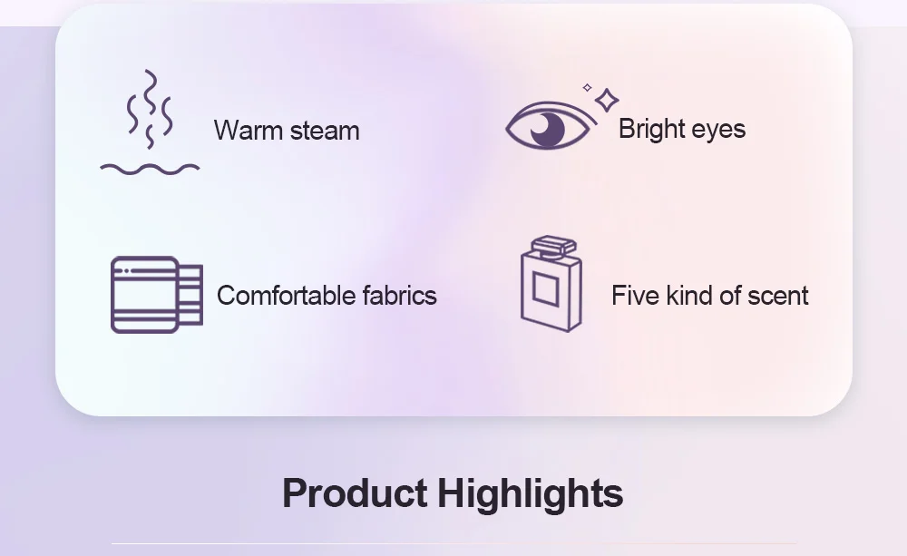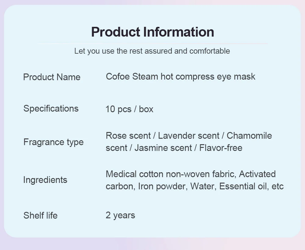 Основные характеристики:1. Пять ароматических паровых масок для глаз.2. Романтический Аромат глаз спа.3. Влажности.4. Снять.5. Яркие глаза.6. Защита глаз.